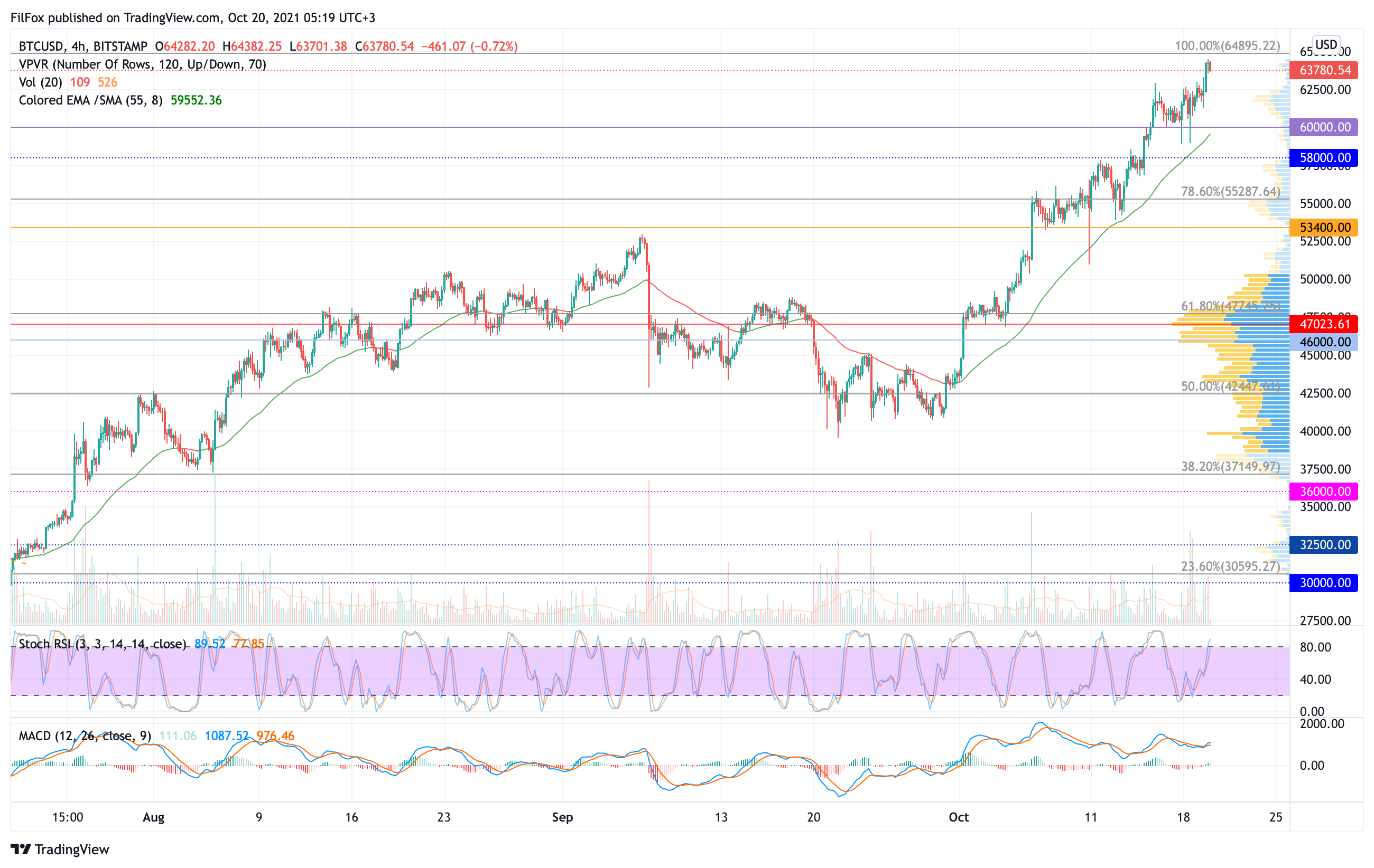 В первой половине дня откат может продолжится, но похоже, что быки намерены сегодня прорвать стопроцентный уровень фибоначчи и обновить исторический максимум цены Bitcoin. Как мы уже прогнозировали, прорыв может быть в район отметки 66000.00 USD.
