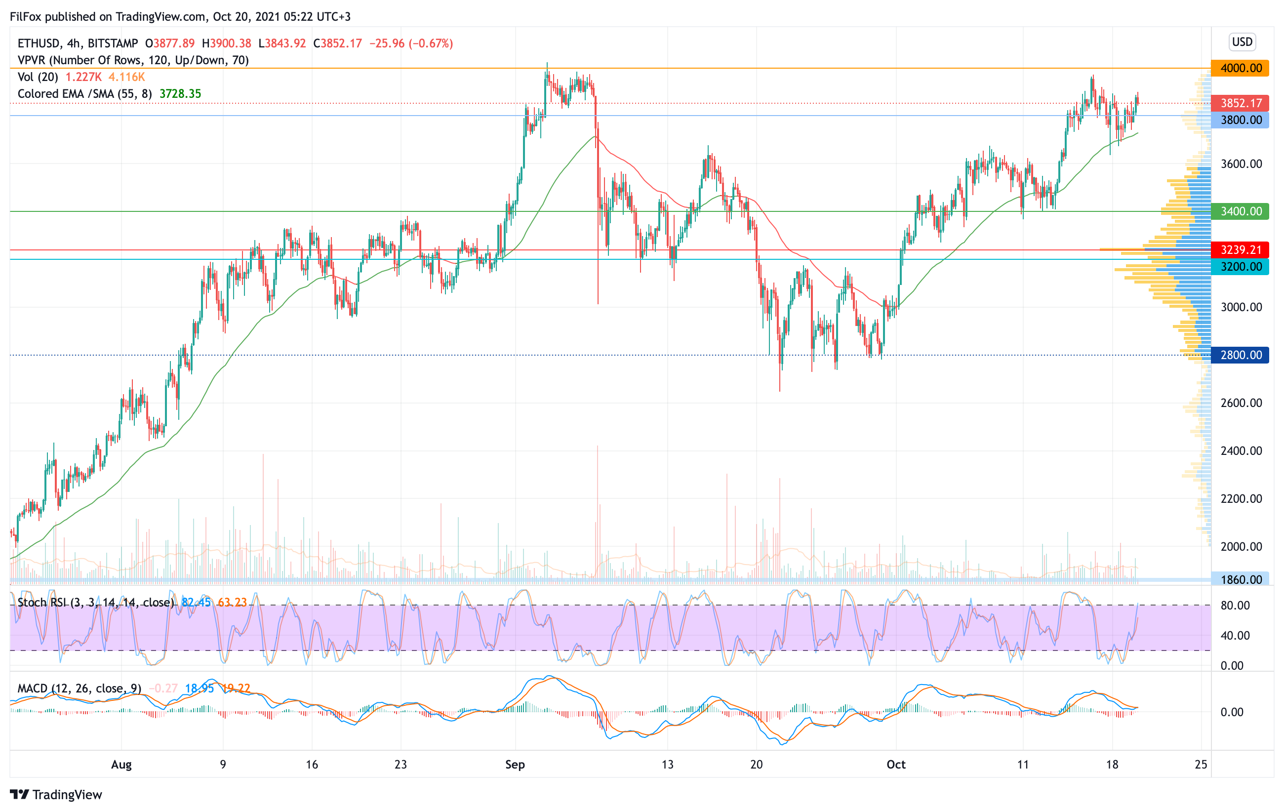 Вчера цена Ethereum консолидировалась на уровне 3800.00 USD. Положительная динамика криптовалютного флагмана не позволила медведям усилить натиск и значительно потеснить цену эфира. Дневной минимум зафиксирован в районе отметки 3750.00 USD.