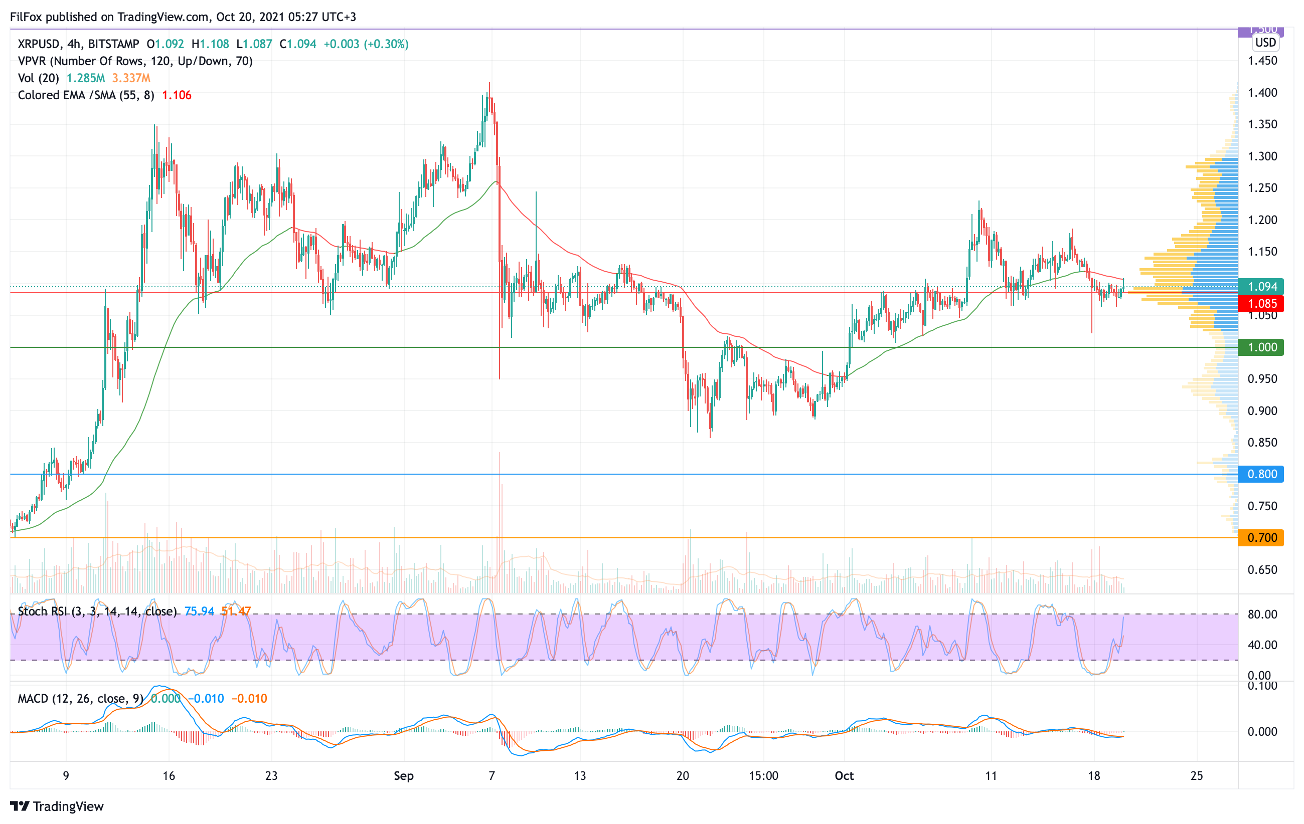 Вчера цена XRP продолжила консолидацию в узком боковом диапазоне на линии POC (1.085 USD). Сегодня ночью на мелких объёмах покупатели прокололи верхнюю границу диапазона (1.105 USD) и обозначили недельный максимум в точке 1.108 USD.