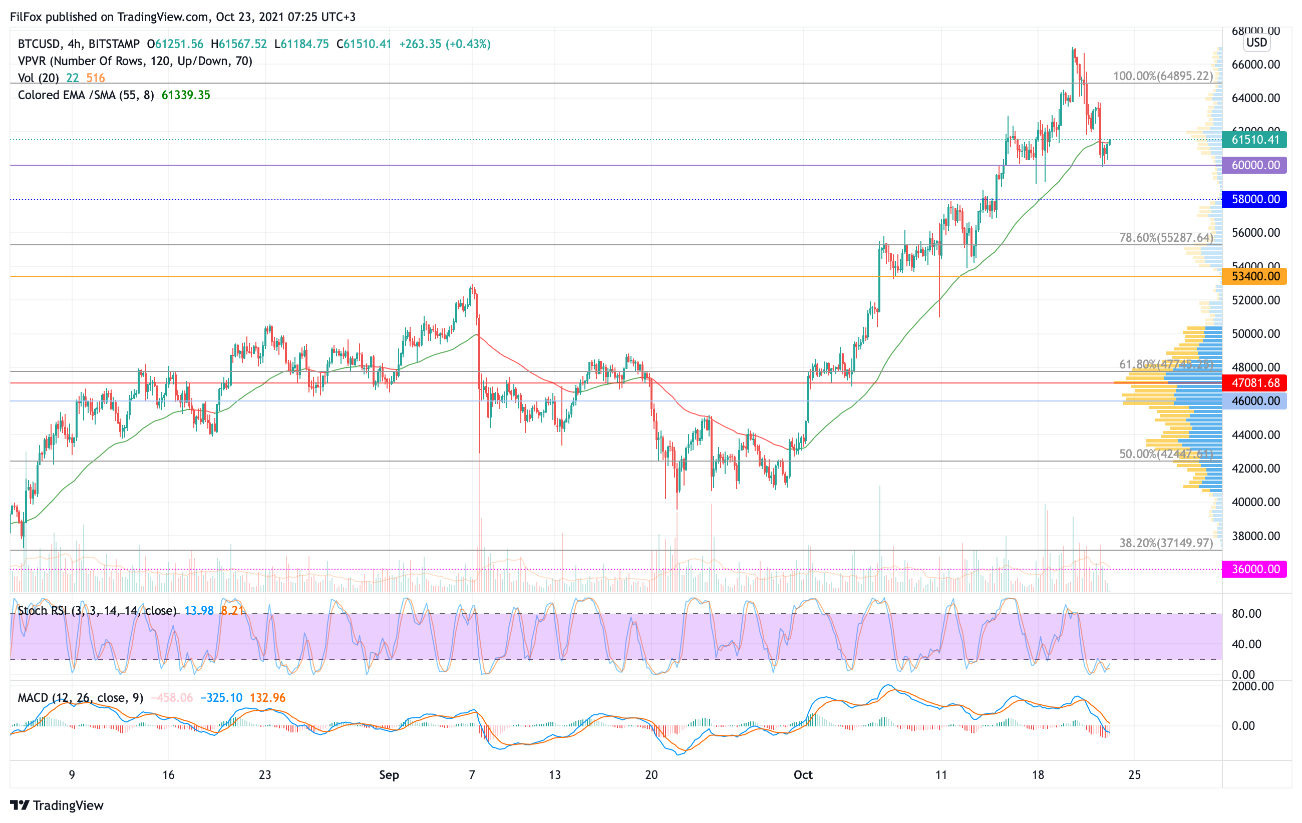 Однако, на выходных возможен очередной медвежий импульс, который способен протестировать поддержку 58000.00 USD. По нашим расчетам, индикаторные линии Stoch RSI на дневном тайм-фрейме к этому времени будут в зоне перепроданности, а следовательно, в начале следующей недели можно ожидать восстановление пары в зону исторических максимумов.