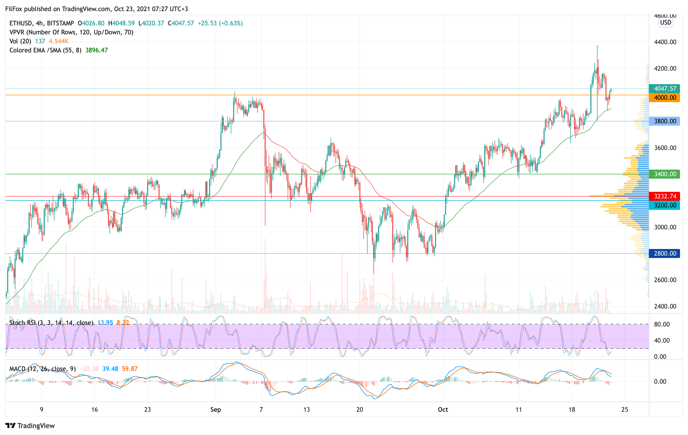 Цена эфира отскочила от четырёхчасовой EMA55, а на сегодняшнее утро восстановилась выше четырёх тысяч долларов. Если быки попытаются сформировать мощный импульс, то на выходных возможен новый абсолютный максимум в районе отметки 4500.00 USD.