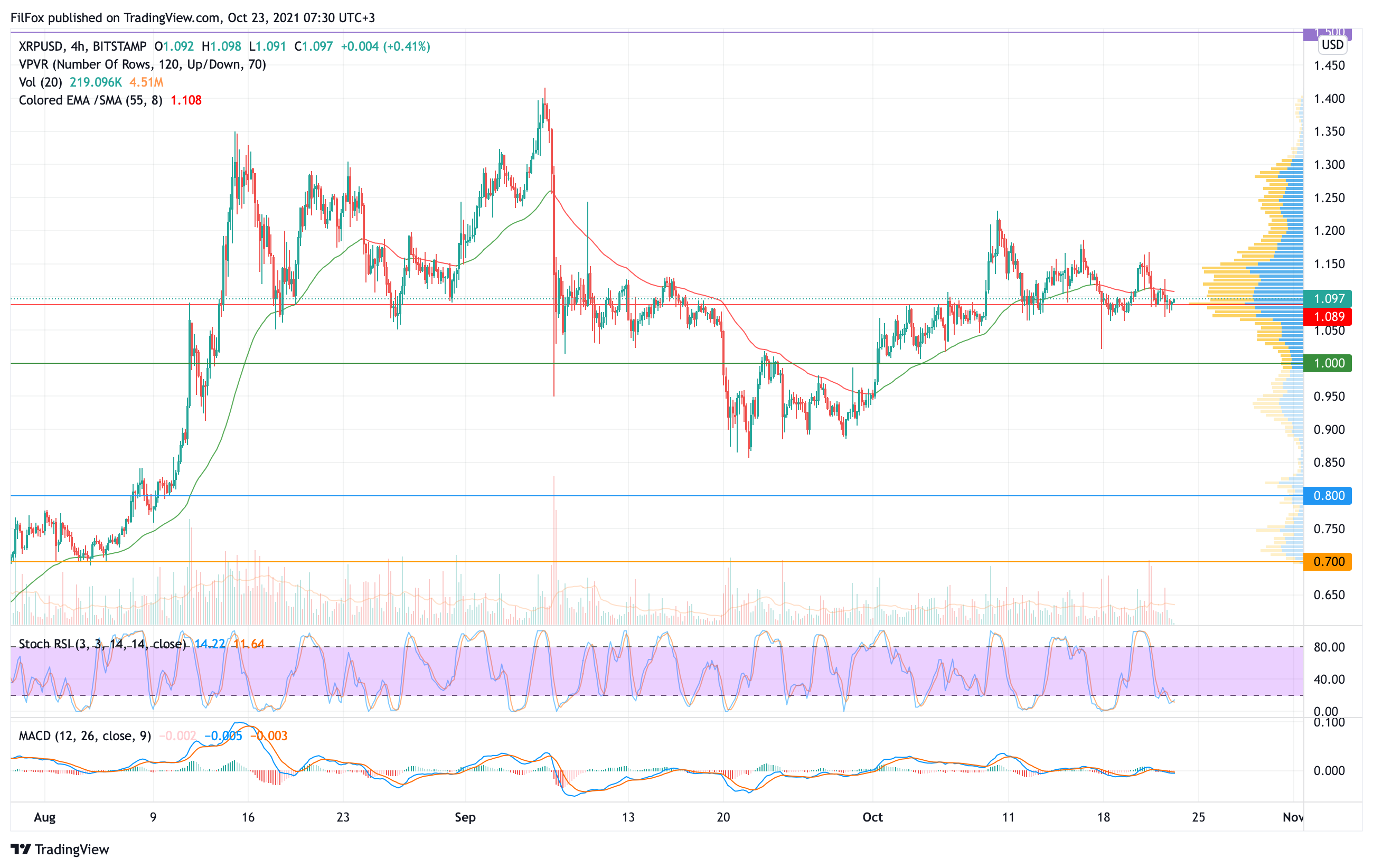 Ночью объёмы сократились, а цена стабилизировалась в районе линии POC. Усиление медвежьего давления на выходных может откатить цену XRP к психологической отметке 1.00 USD.