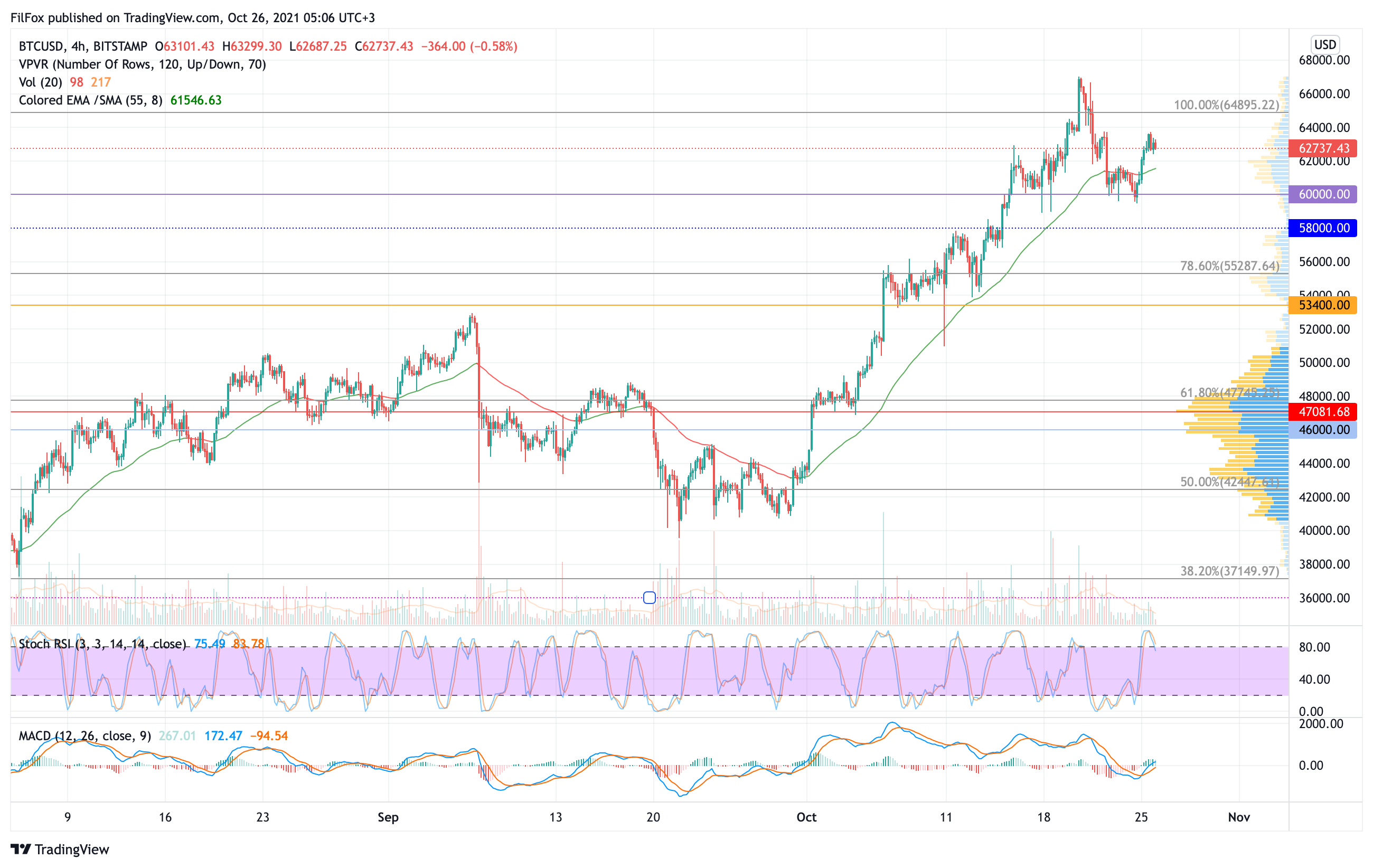 В завершении дня продавцы активизировались и вернули пару на уровень 62750.00 USD. Сегодня утром откат может продолжится к четырёхчасовой EMA55, но вскоре можно ожидать возобновления позитивной динамики и рост к уровню 100% фибо (64895.22 USD).