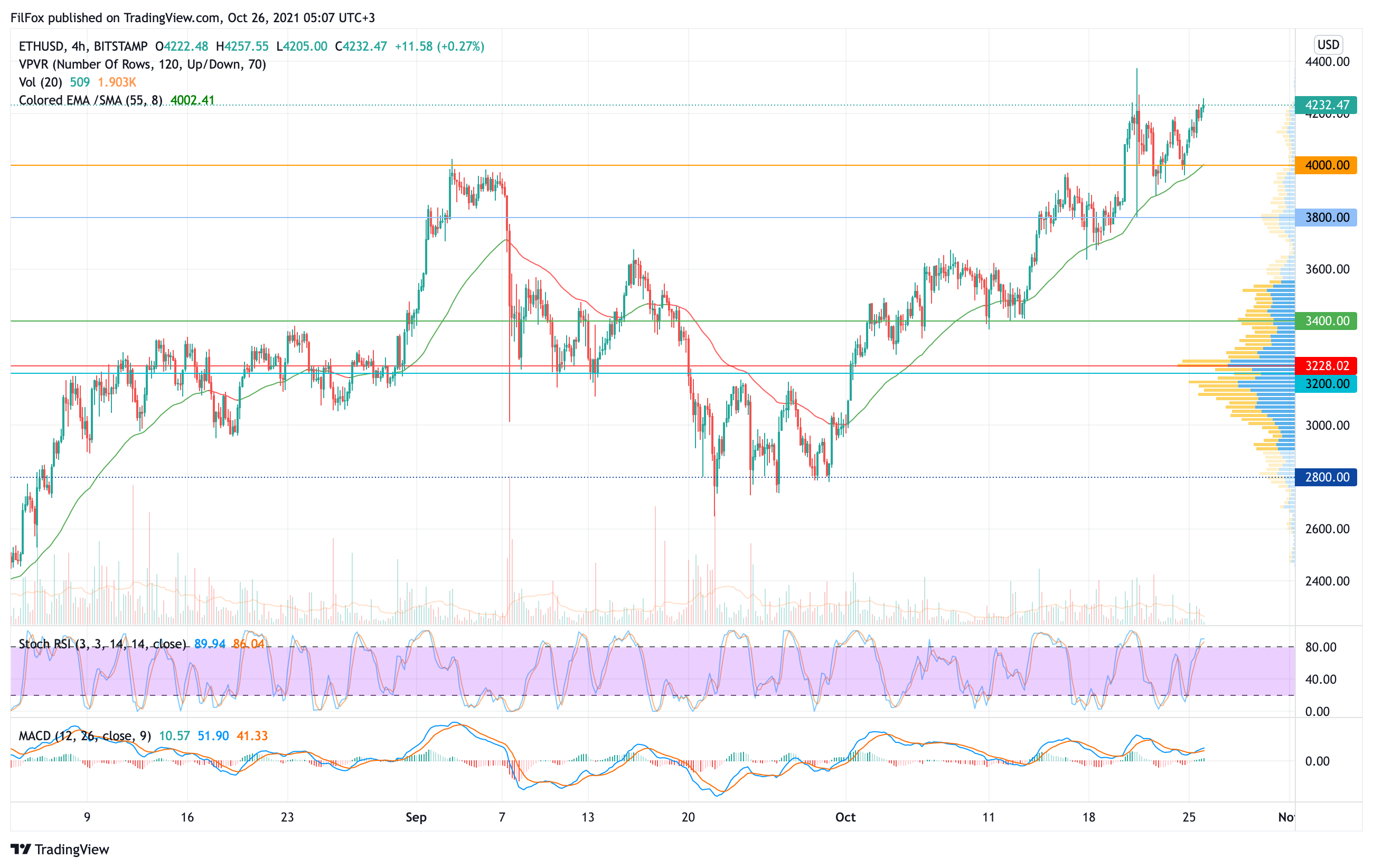 Вчера цена Ethereum только во второй половине дня смогла преодолеть сопротивление 4200.00 USD. Сегодня ночью объёмы покупок были небольшие, тем не менее пара смогла обозначить локальный максимум в районе отметки 4257.00 USD.