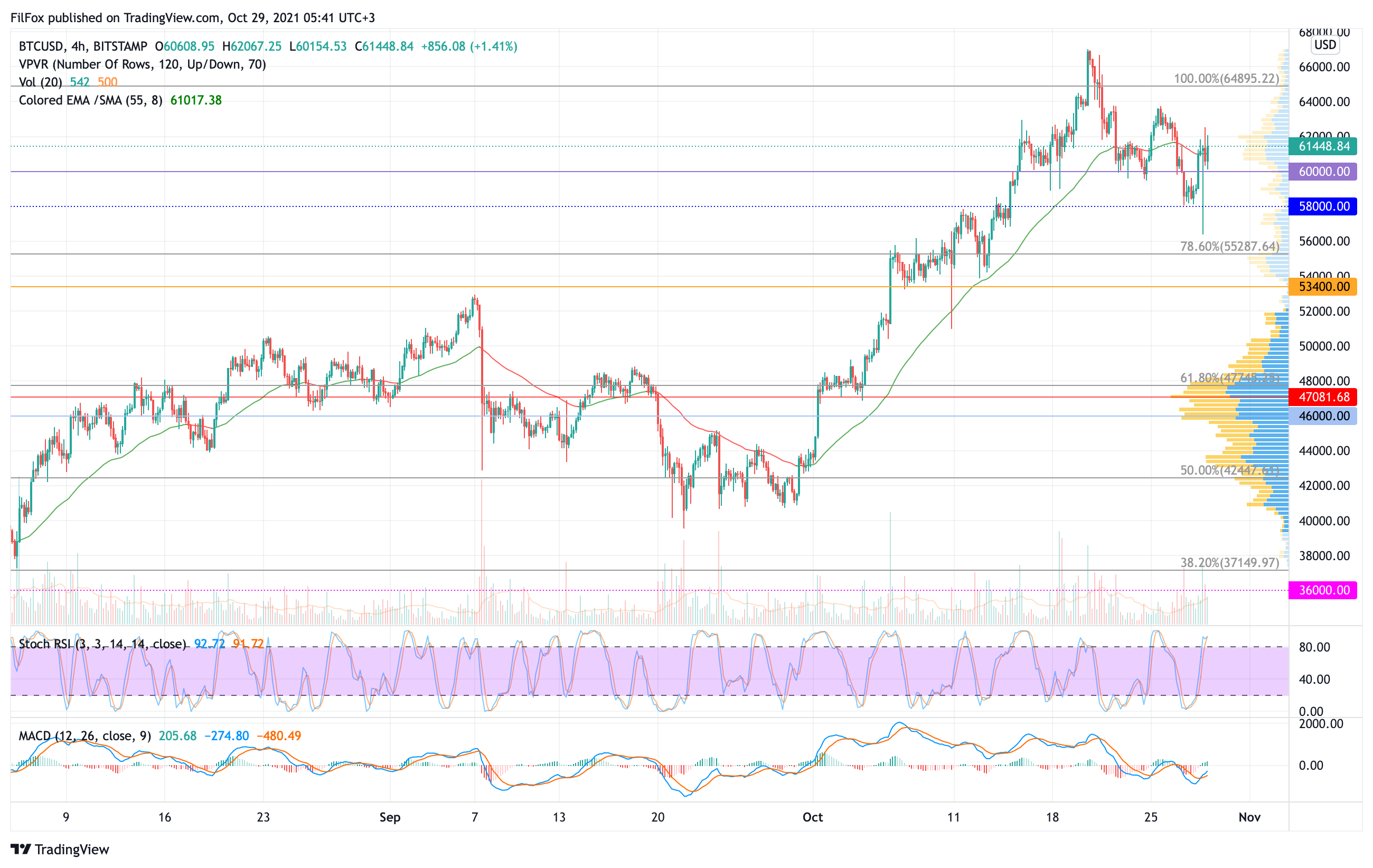 Во второй половине дня пара пыталась закрепиться выше четырёхчасовой скользящей средней EMA55, но в какой-то момент мощный медвежий импульс проколол поддержку 58000.00 USD и зафиксировал дневной минимум в точке 56425.00 USD. Быки быстро откупили весь объём и восстановили пару в область средних цен. После такого жесткого ценового всплеска волатильность стала затухать и на утро пара закрепилась в районе отметки 61500.00 USD.