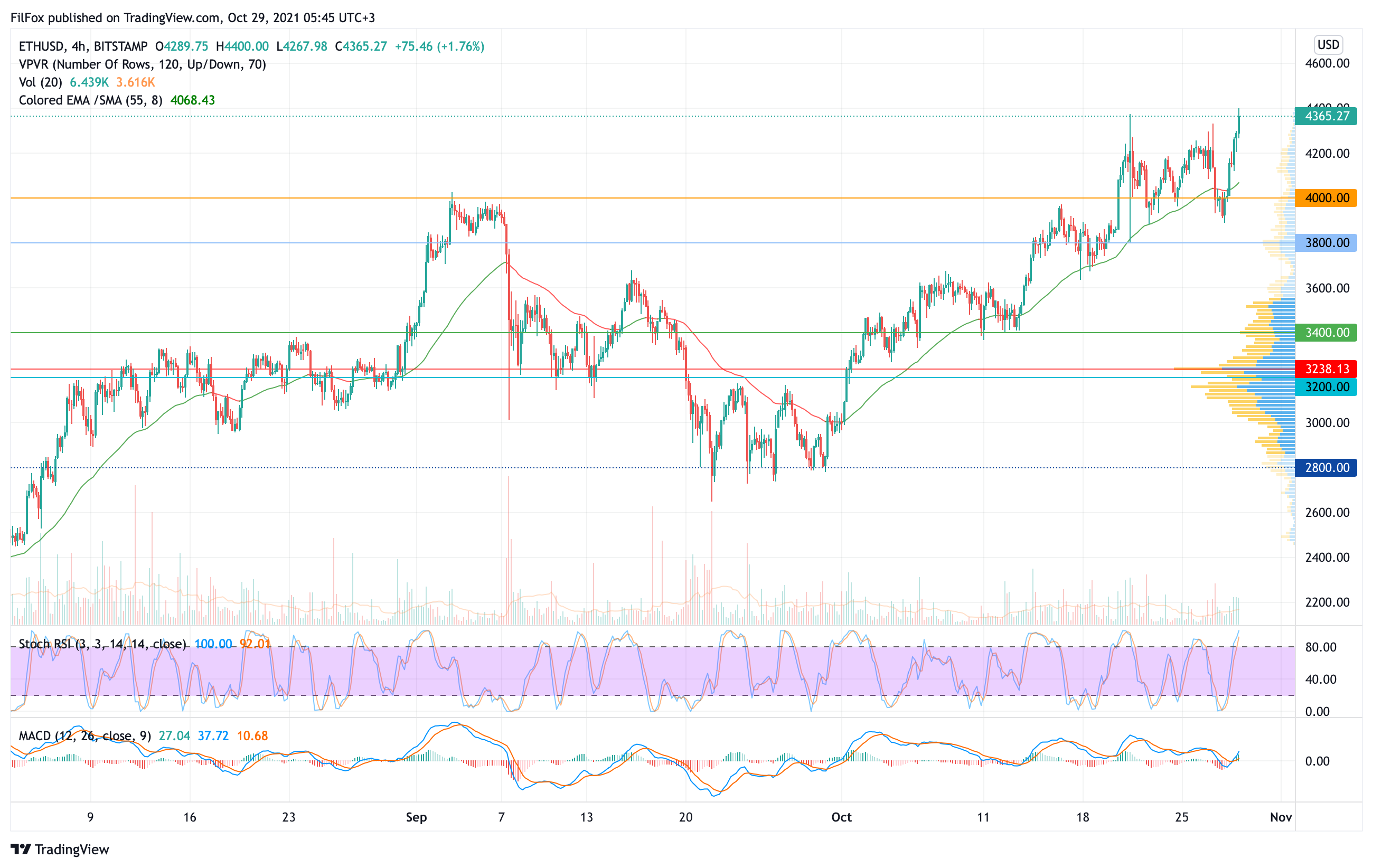 Цена Ethereum бьёт исторический рекорд и обновляет абсолютный максимум в точке 4400.00 USD. Смогут ли быки продолжить сегодня забег?