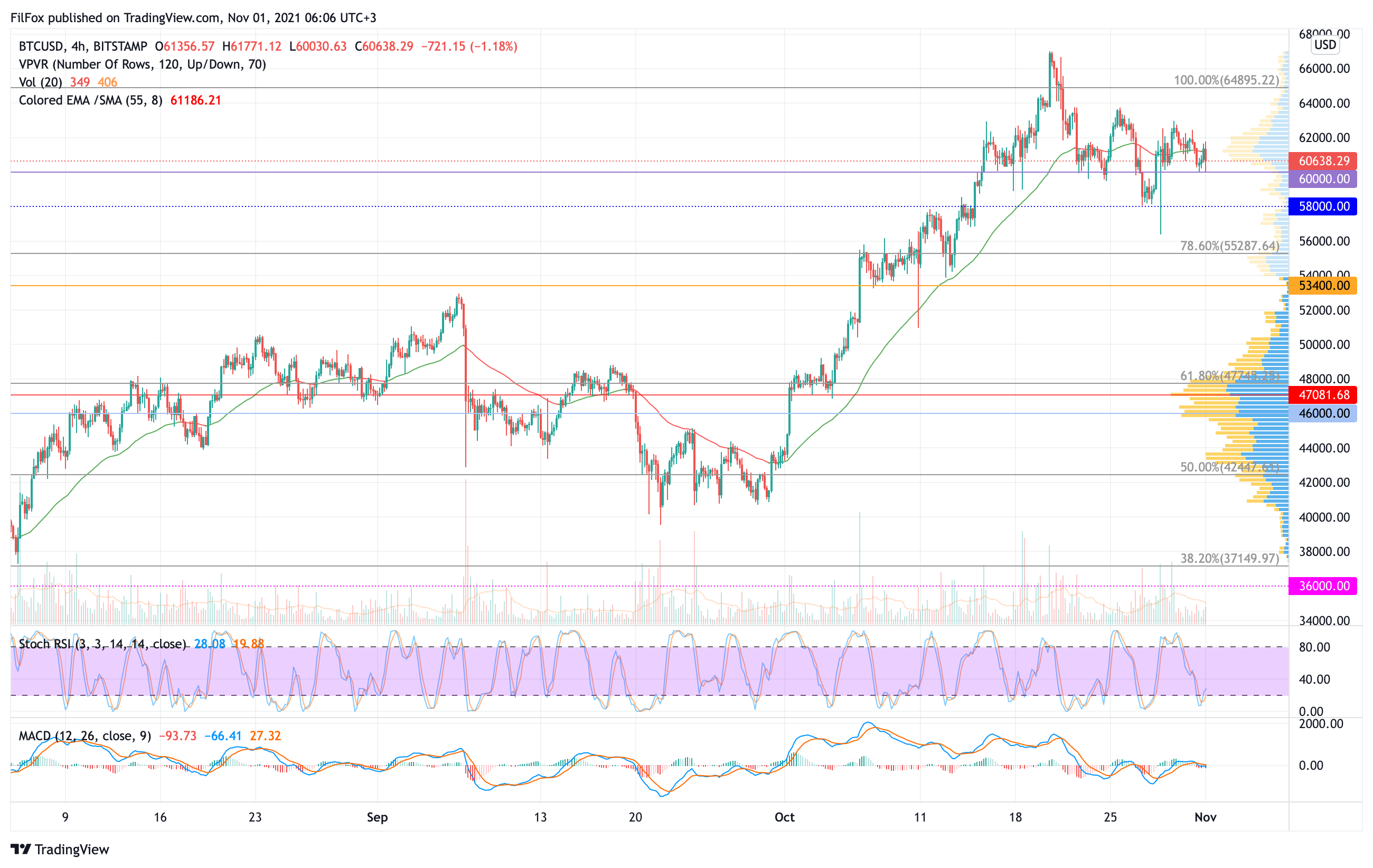 На выходных цена биткоина продолжила снижение к поддержке 60000.00 USD. В воскресенье днём пара протестировала этот психологический уровень, а до конца дня попыталась немного восстановиться.