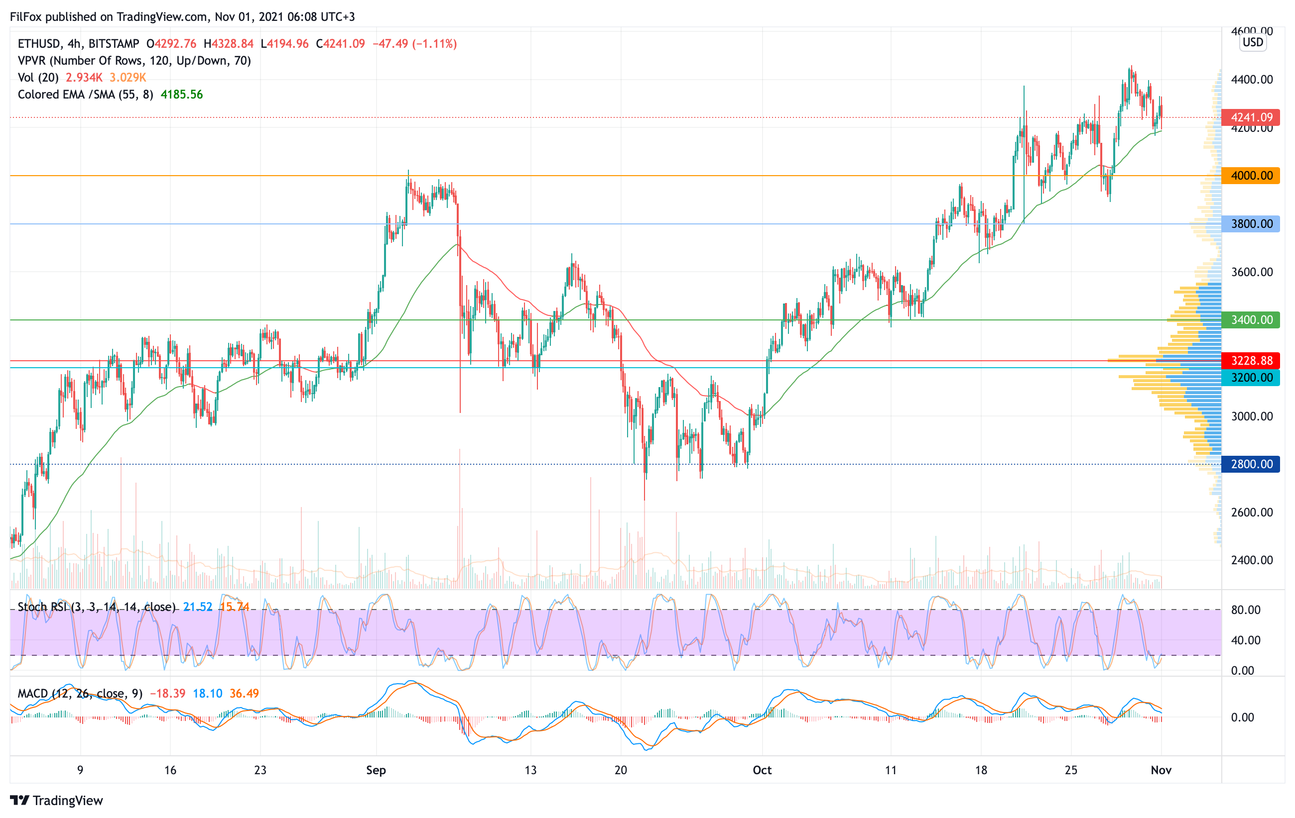 На минувших выходных быки не смогли продолжить забег, и до конца октября цена ETH не успела обновить максимум в точке 4500.00 USD.