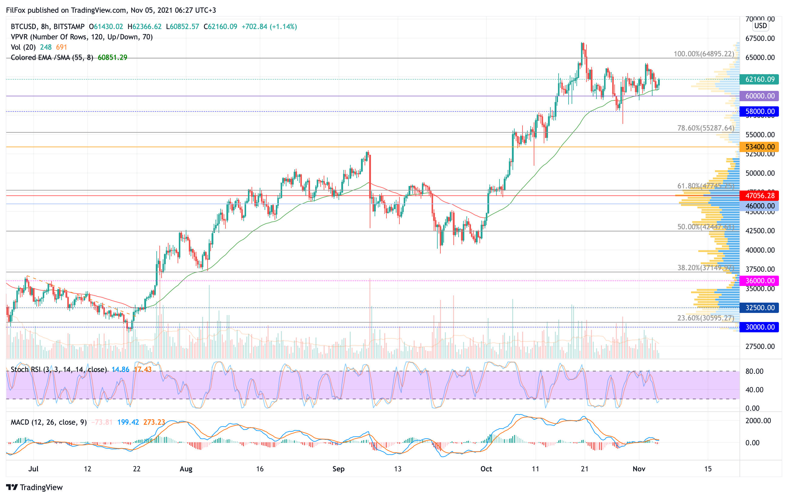 Вчера в первой половине дня цена BTC пыталась удержаться в консолидации в области 61500.00 USD, но вечером продавцы продавили этот уровень и поздно ночью пара откатилась к скользящей средней EMA55.