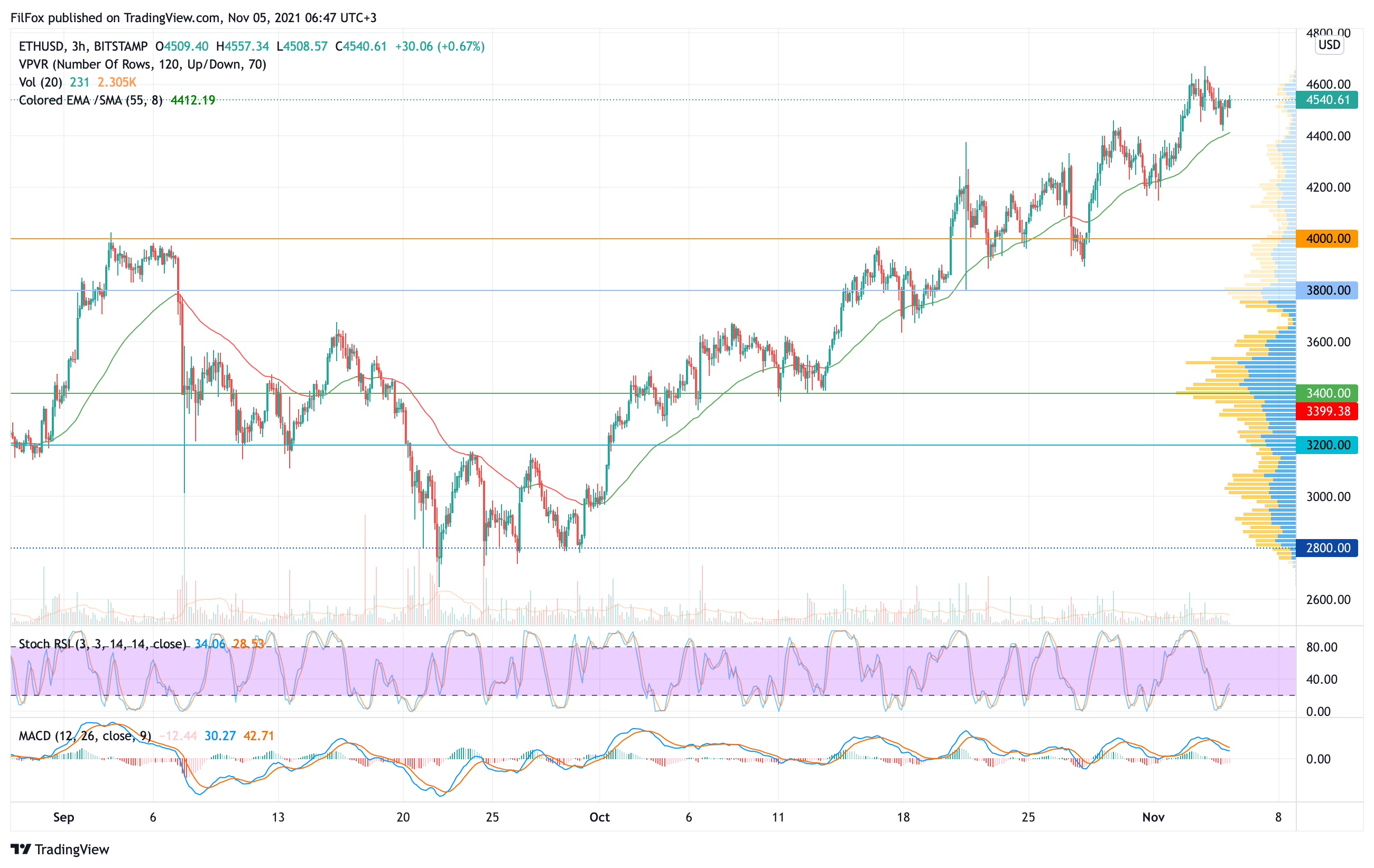 Вчера цена Ethereum консолидировалась в боковом диапазоне в районе поддержки 4500.00 USD. Во второй половине дня объёмы покупок начали сокращаться и медведи оттеснили цену эфира ниже этого уровня поддержки.