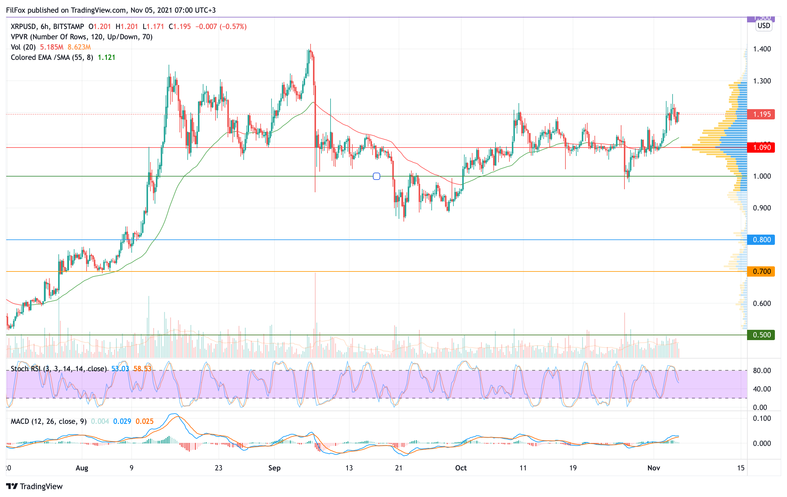 Вчера утром цена XRP не смогла продолжить рост выше сопротивления 1.250 USD. В течение дня пара постепенно снижалась, пока не достигла поддержки в районе 1.165 USD. Вечером снижение замедлилось, и цена смогла немного восстановиться.