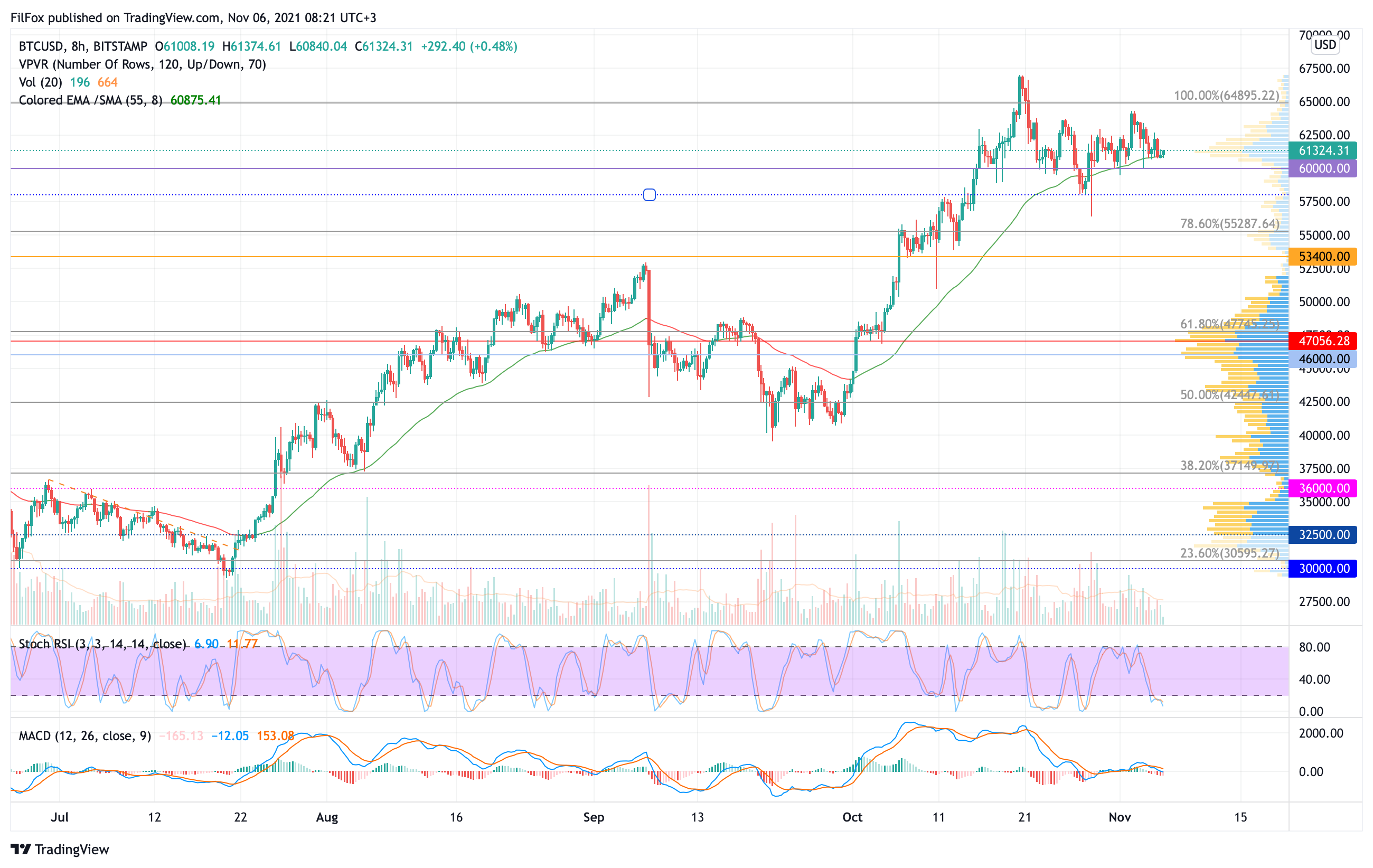 Сейчас эта скользящая средняя надёжно удерживает цену в боковой консолидации. После краткосрочного боковика, пара возобновит попытки восстановиться выше уровня 100% фибо (64895.22 USD).