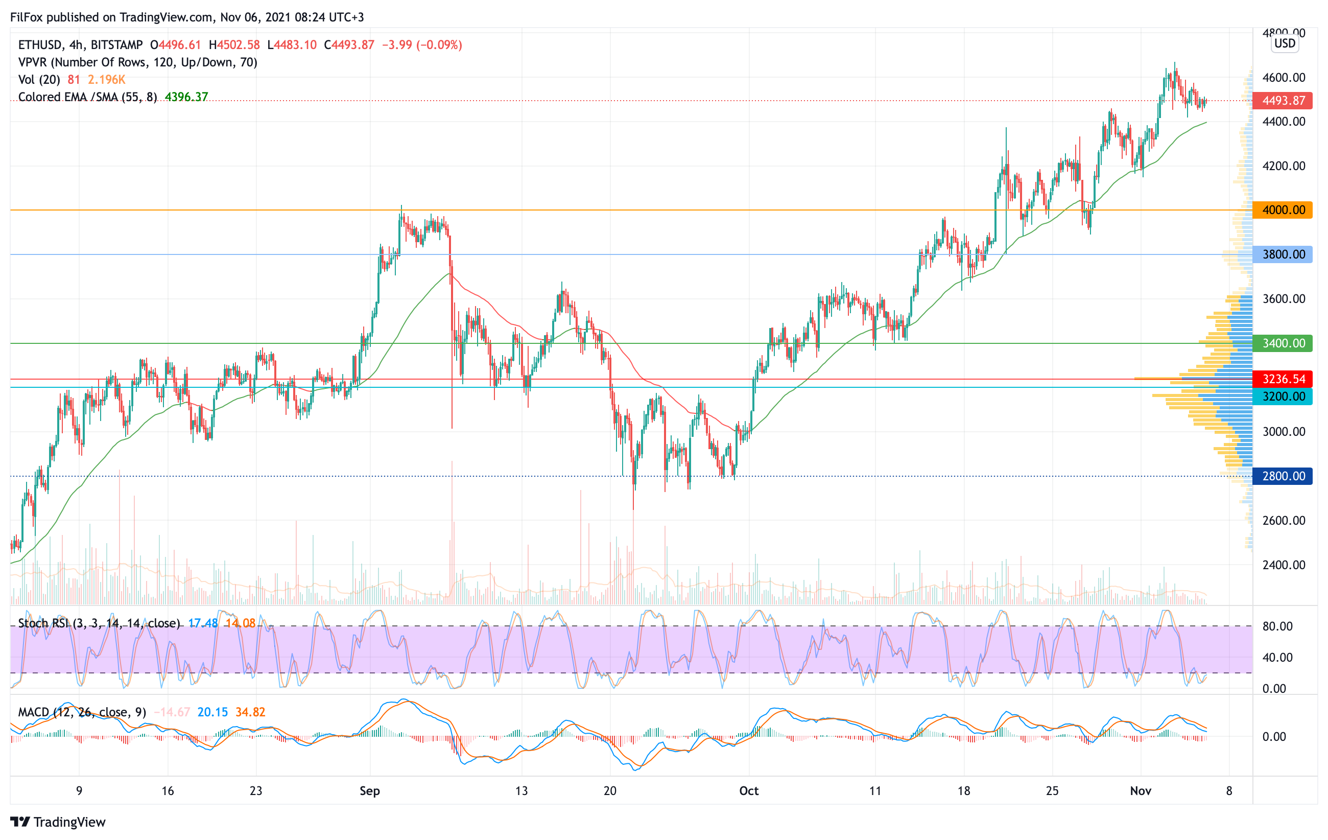 Вчера утром, на мелких объёмах, покупателям не удалось продолжить восстановление цены Ethereum в зону максимума. Пара не смогла долго продержаться выше отметки 4500.00 USD. Уже во второй половине дня продавцы оттеснили цену в область 4450.00 USD, а дневной минимум обозначен в районе отметки 4446.00 USD.