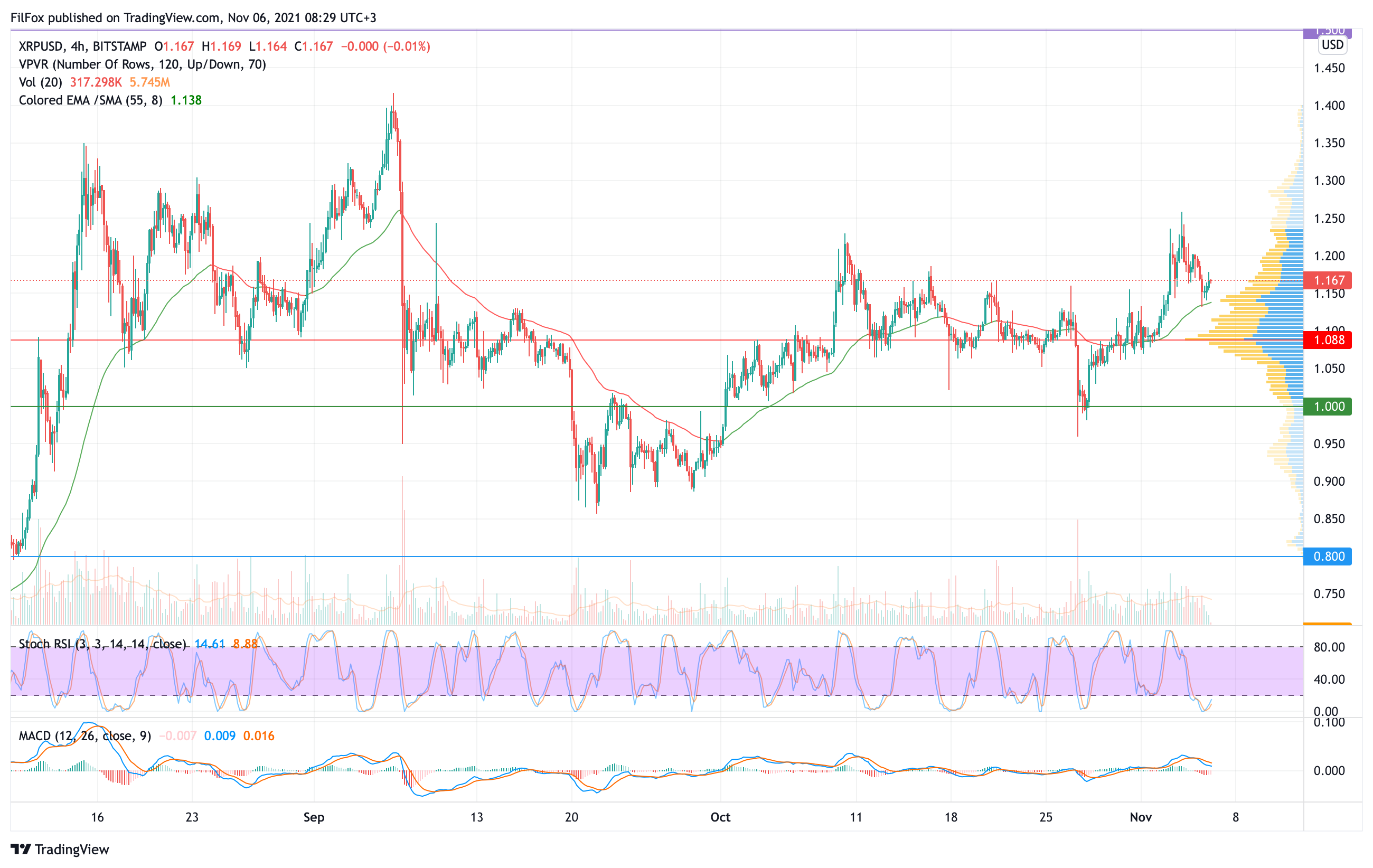Вчера быки не смогли восстановить цену XRP в область месячного максимума. В первой половине дня давление продавцов возрастало, и вечером цена откатилась к поддержке четырёхчасовой EMA55.