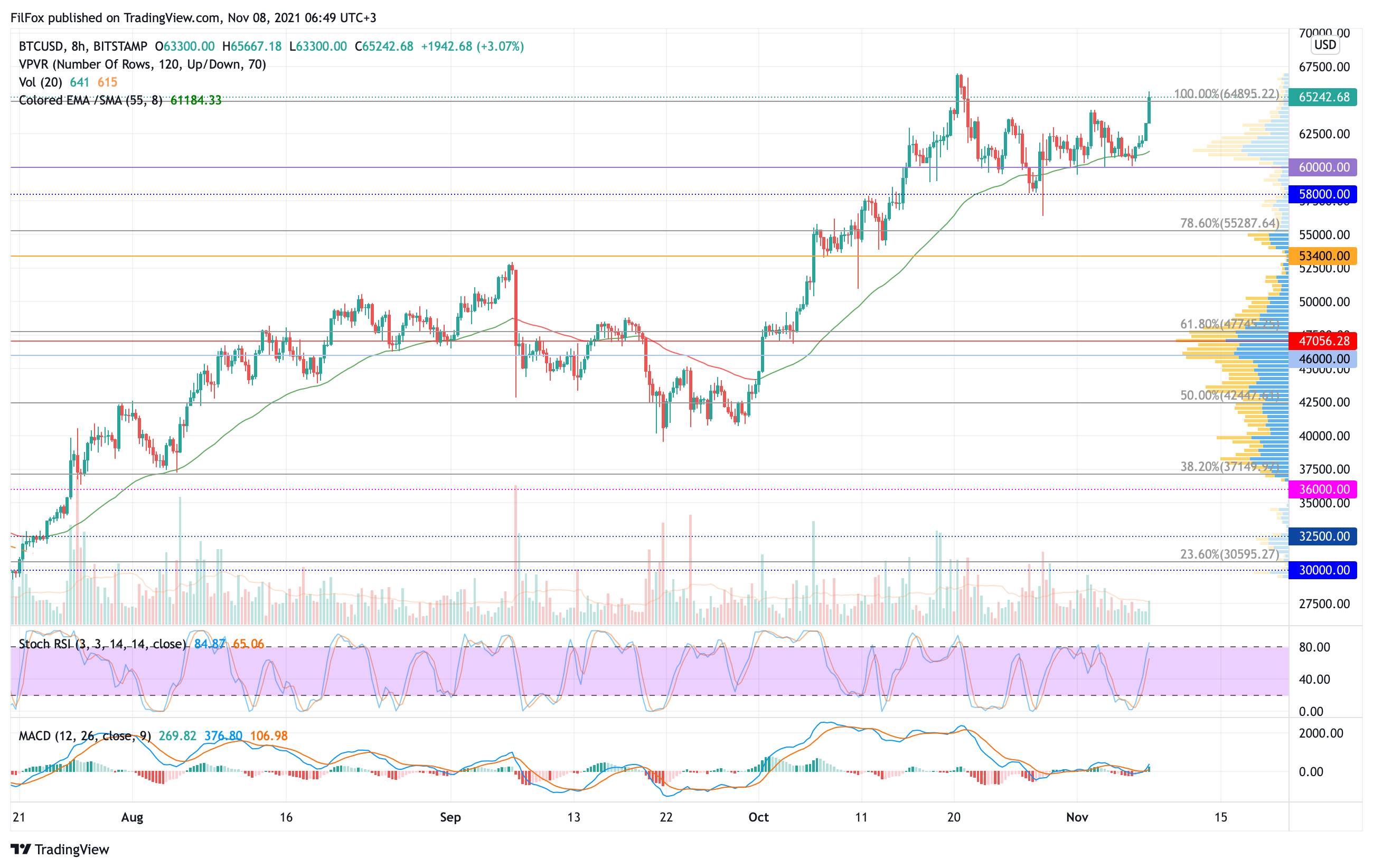 Эта неделя началась со стремительного роста. За прошедшую ночь пара пробила сопротивление 100% фибо (64895.22 USD) и пытается закрепиться над этим уровнем. Если быки смогут продолжить забег, то дневной максимум возможен в области 68100.00 USD.