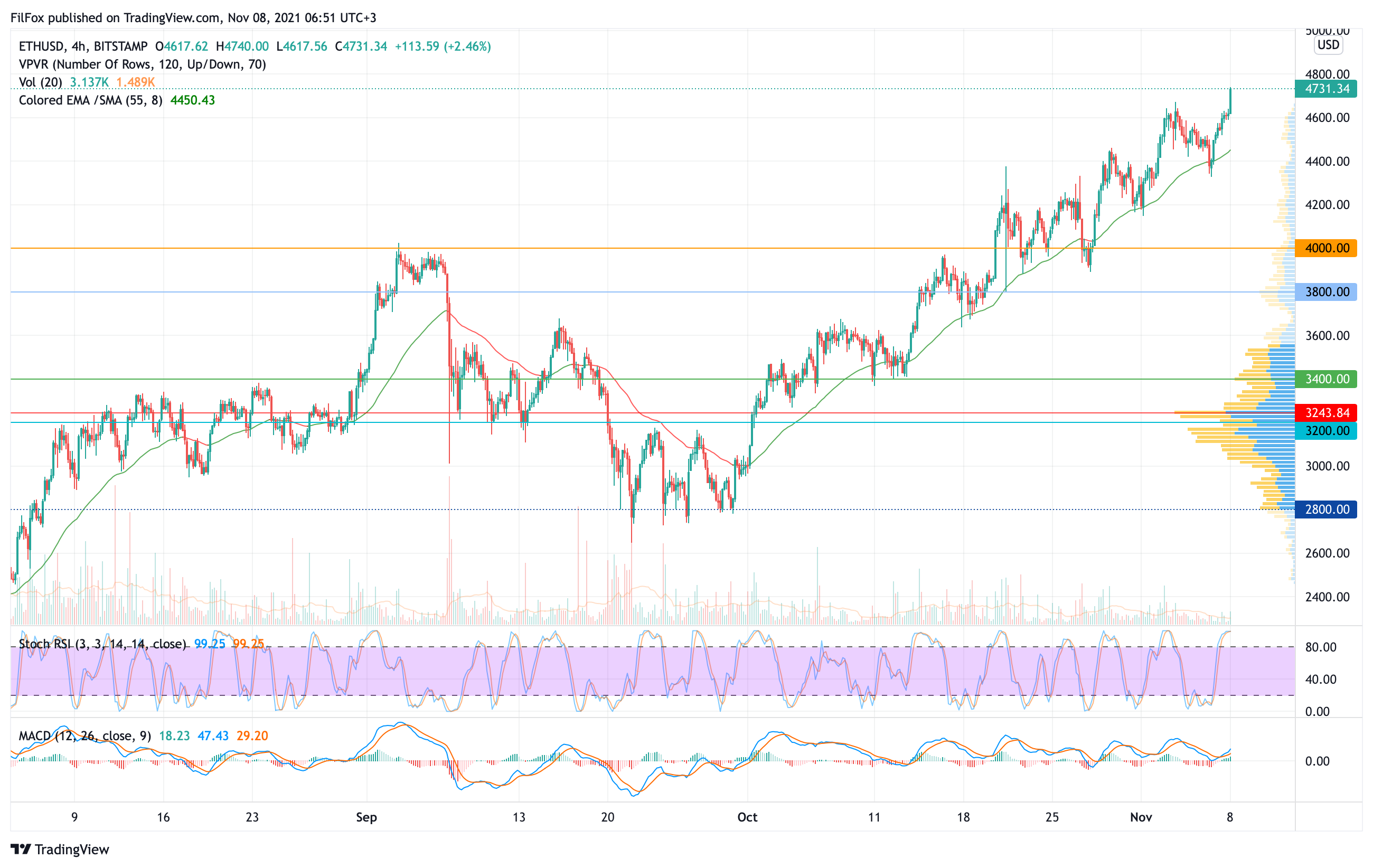В субботу цена Ethereum откатилась к поддержке четырёхчасовой EMA55, а в воскресенье пара полностью восстановилась в зону абсолютного максимума. Сегодня ночью быки продолжили забег и обновили максимум до уровня 4740.00 USD.
