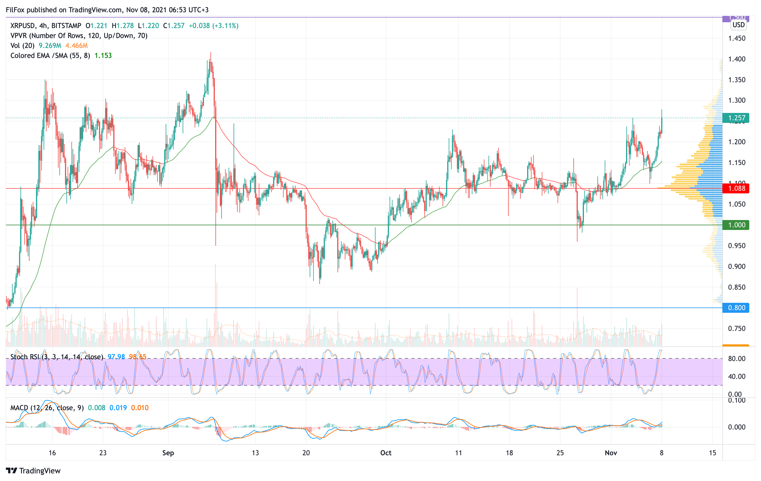 На прошедших выходных цена XRP протестировала поддержку 1.100 USD и восстановилась в область месячного максимума. Начало текущей недели ознаменовалось обновлением ноябрьского максимума в районе отметки 1. 278 USD.