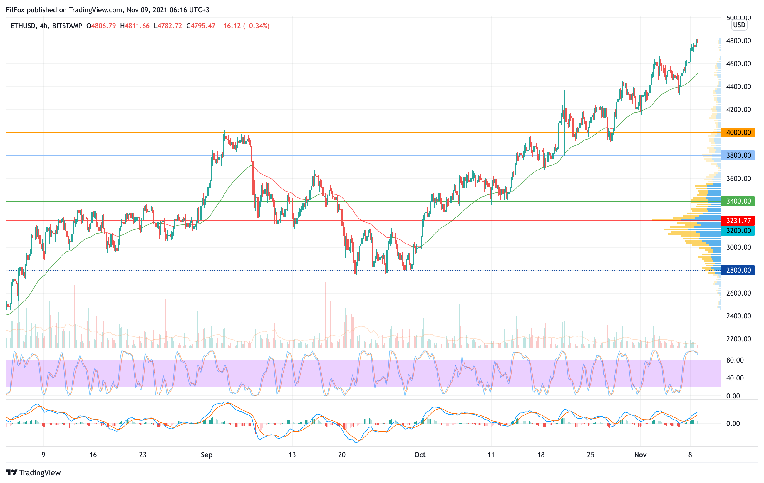 Вчера в течение дня цена Ethereum продолжала расти на средних объёмах. Только сегодня ночью мощным бычьим импульсом удалось прорваться выше сопротивления 4800.00 USD и зафиксировать новый абсолютный максимум в районе отметки 4825.00 USD.