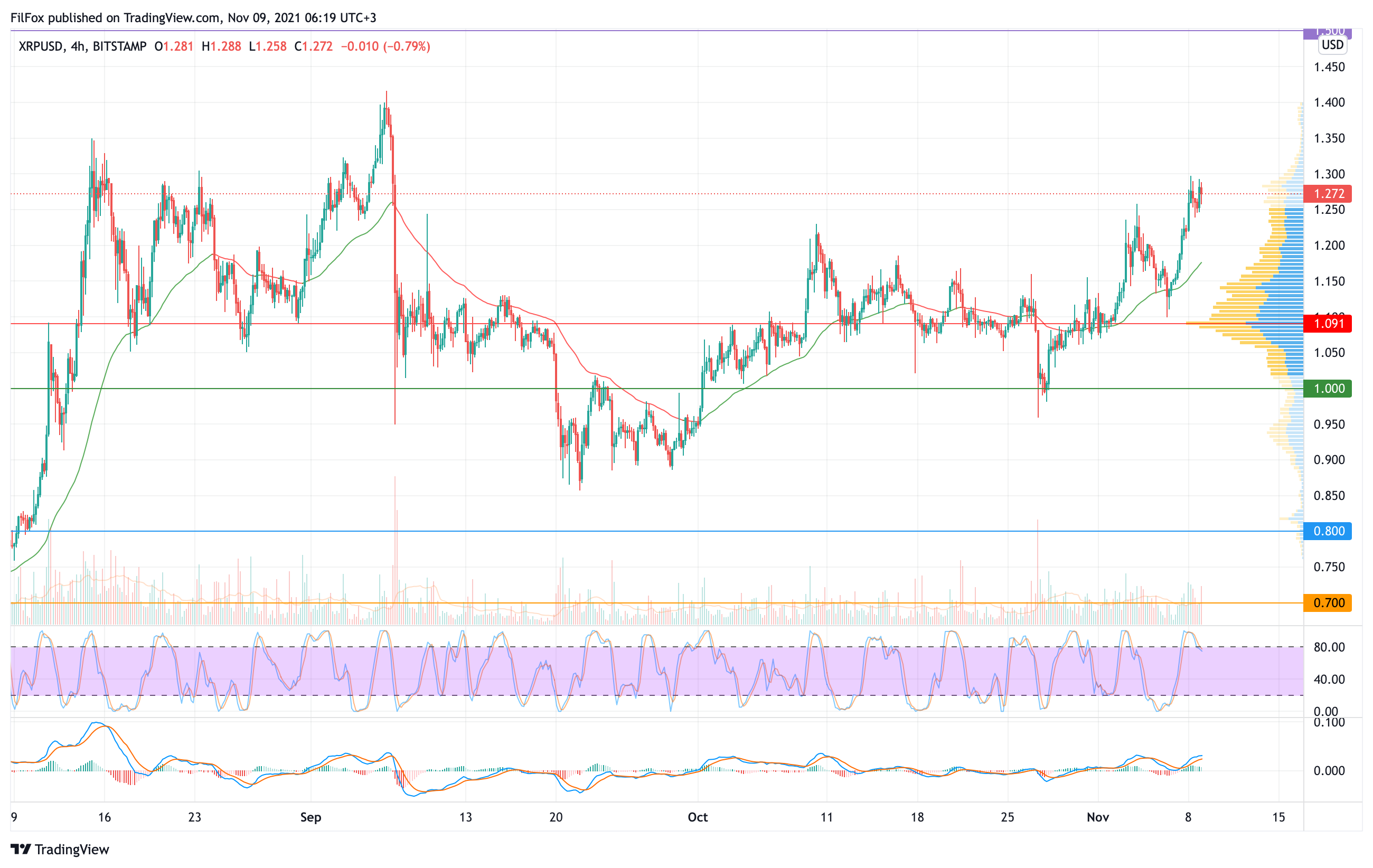 Вчера утром, после месячного максимума в точке 1.297 USD, цена XRP не смогла продолжить рост к сопротивлению 1.300 USD. В течение дня продавцы оттеснили цену в район отметки 1.240 USD и только после дневного минимума в точке 1.239 USD пара смогла восстановиться на прежний уровень.