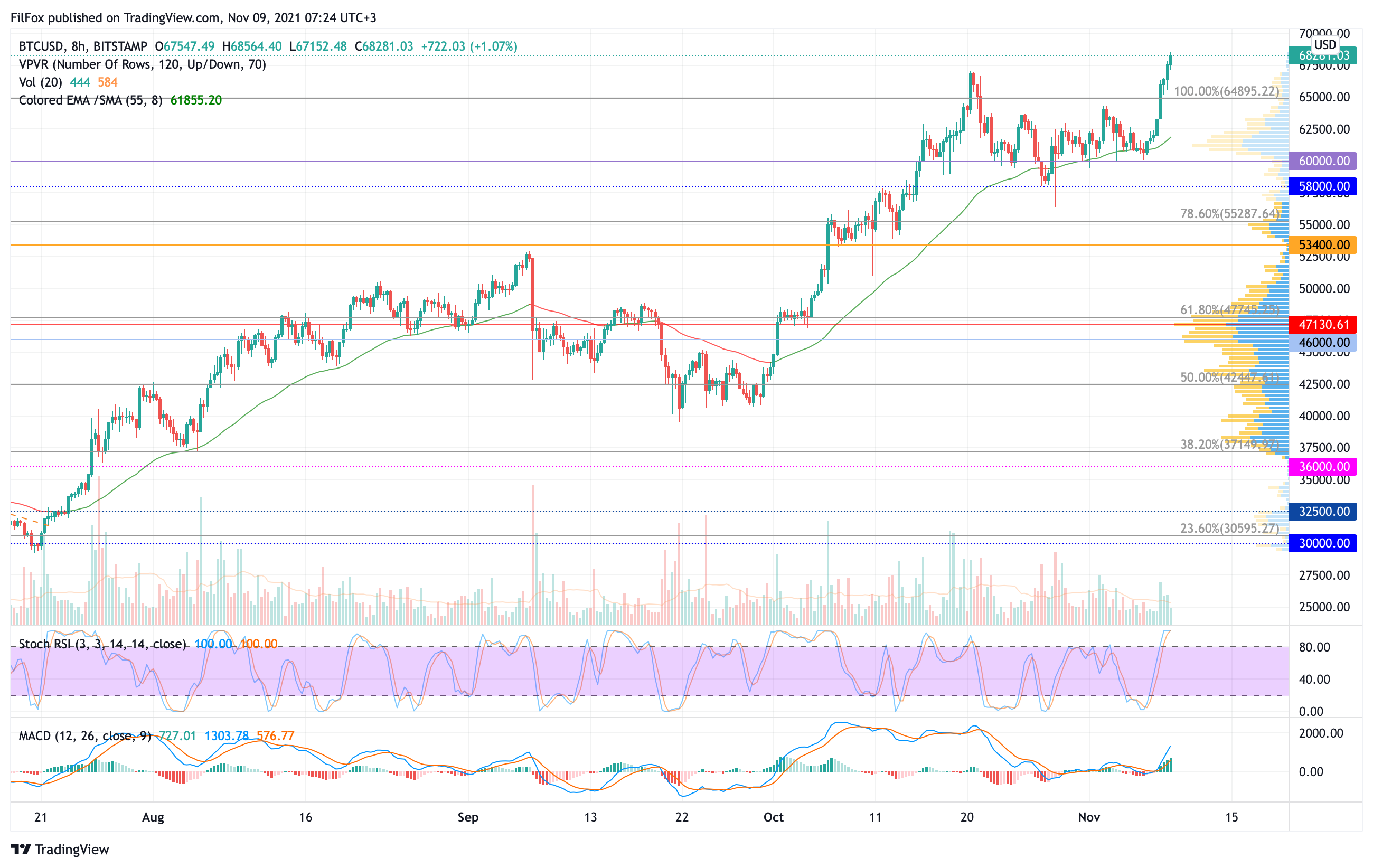 Вчера быки смогли продолжить забег и закрепиться выше 100% фибо (64895.22 USD). Ночью им удалось обновить абсолютный максимум, установленный в районе отметки 67000.00 USD. На сегодняшнее утро пара протестировала уровень 68 560.00 USD.