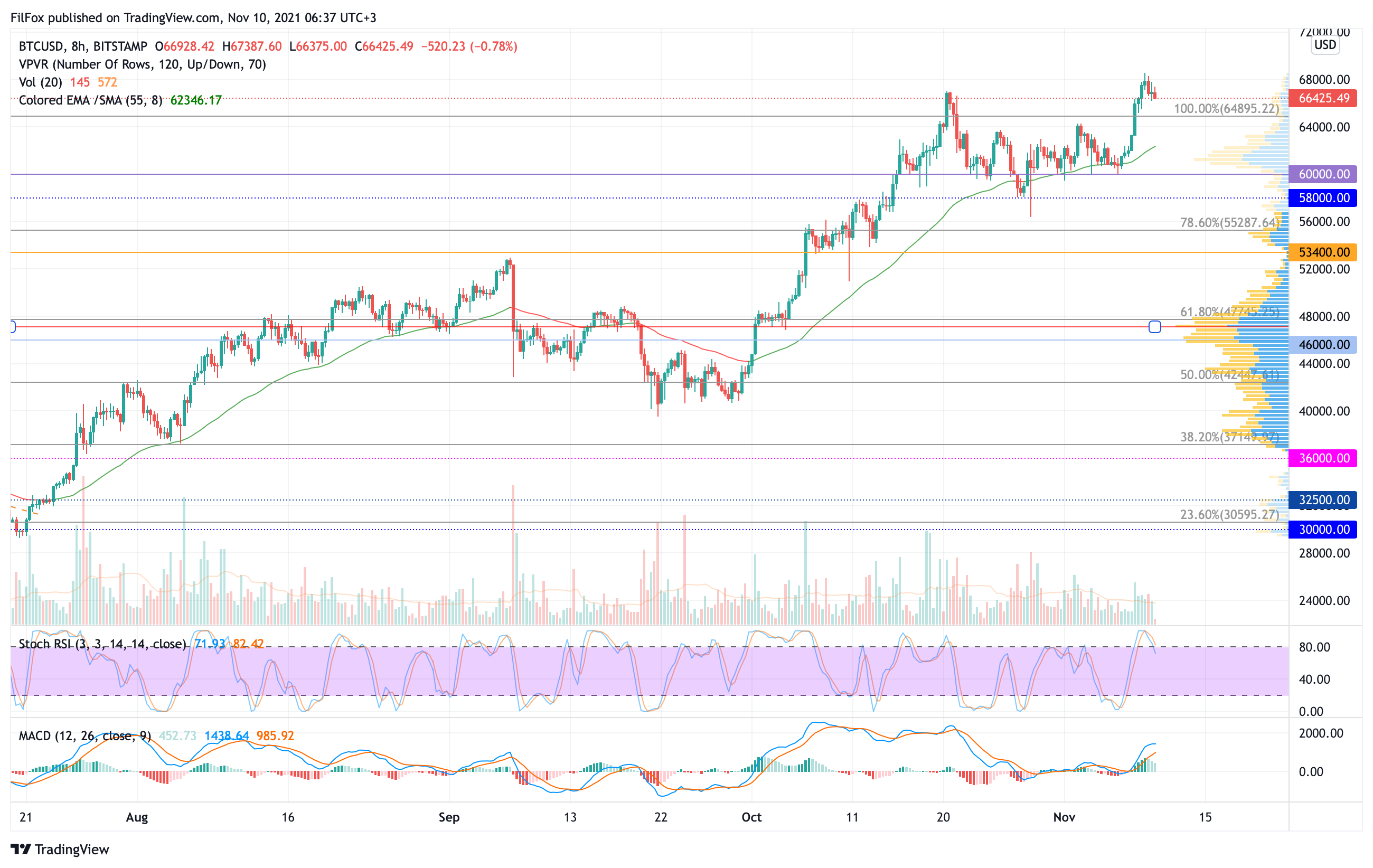 Вчера утром цена биткоина обновила абсолютный максимум до отметки 68564.40 USD. После этого объёмы торгов сократились и быкам не удалось продолжить рост в область 70000.00 USD. Во второй половине дня активизировались продавцы и пара откатилась в район поддержки 66500.00 USD.