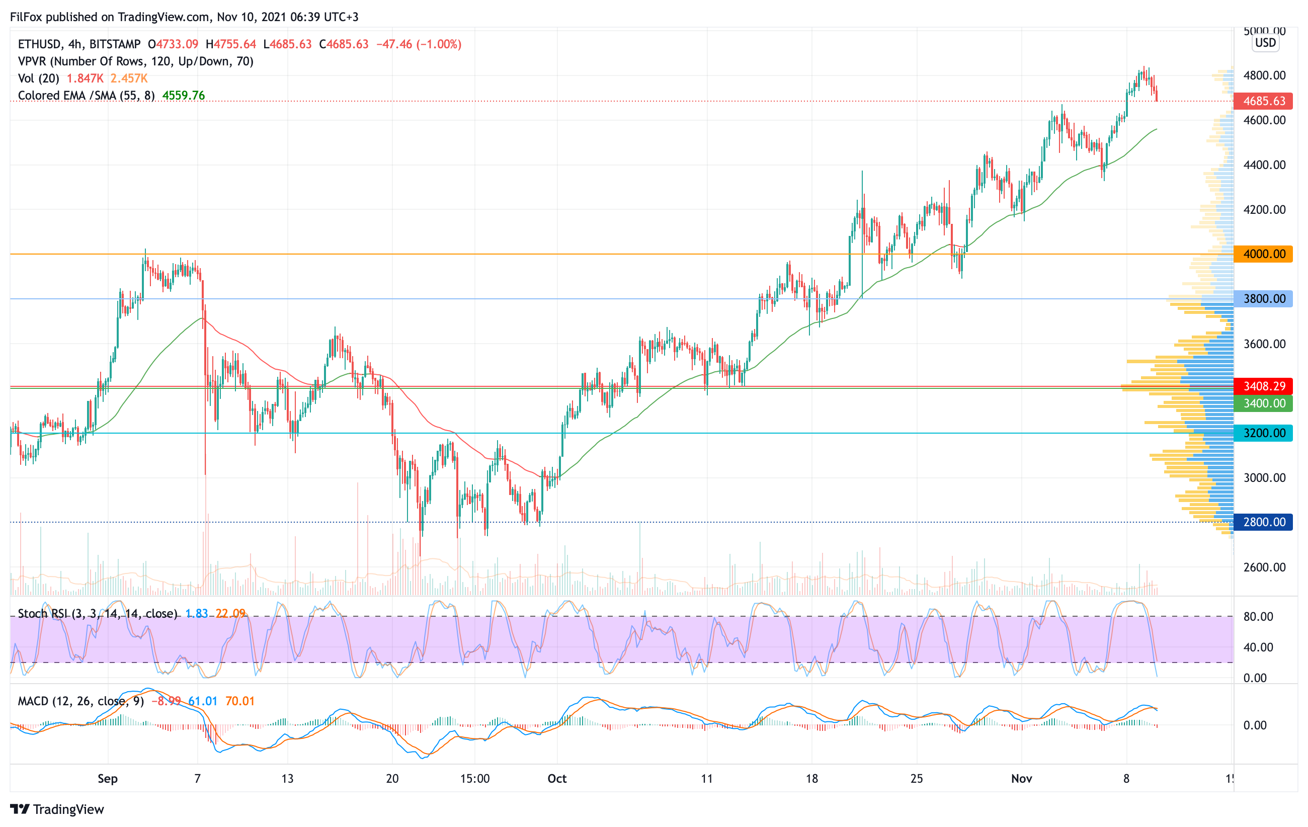 Вчера утром цена Ethereum ещё успела обновить абсолютный максимум в районе отметки 4842.00 USD, прежде чем начался откат к поддержке 4700.00 USD.