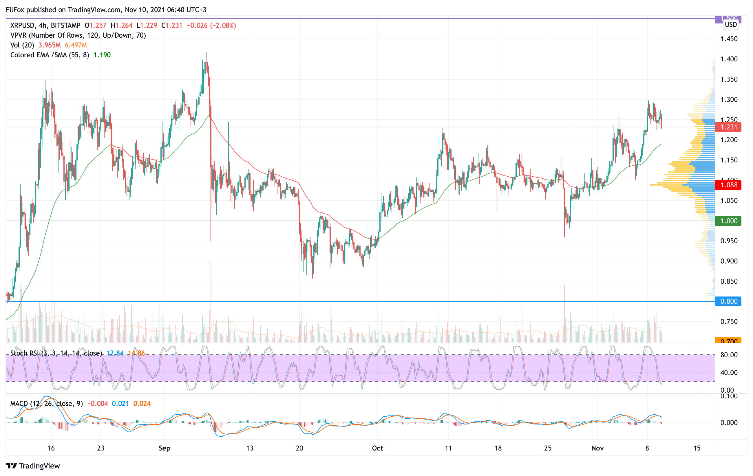 Вчера цена XRP пыталась удержаться выше поддержки 1.240 USD, но сегодня утром медведи продавили этот уровень и пара откатилась в область 1.220 USD.