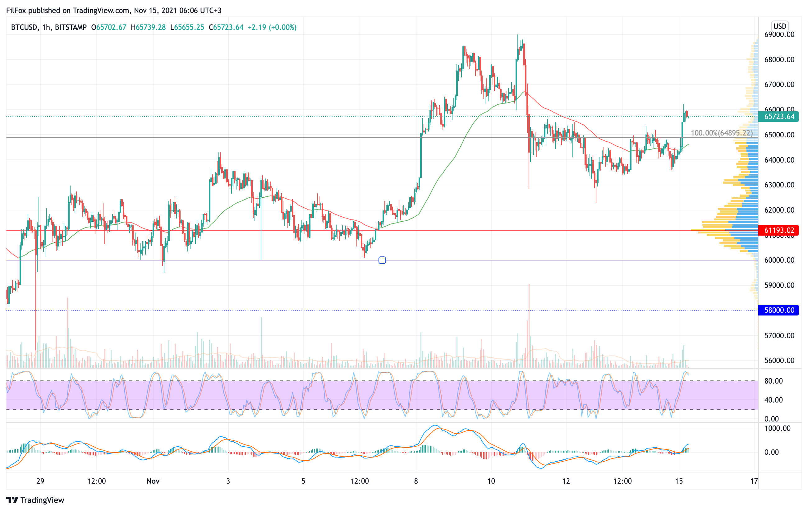 Сегодня ночью покупателям удалось сформировать бычий импульс, который пробил стопроцентный уровень фибоначчи и протестировал отметку 66000.00 USD. На утро объёмы покупок сократились и пара может вернуться в область средних цен.
