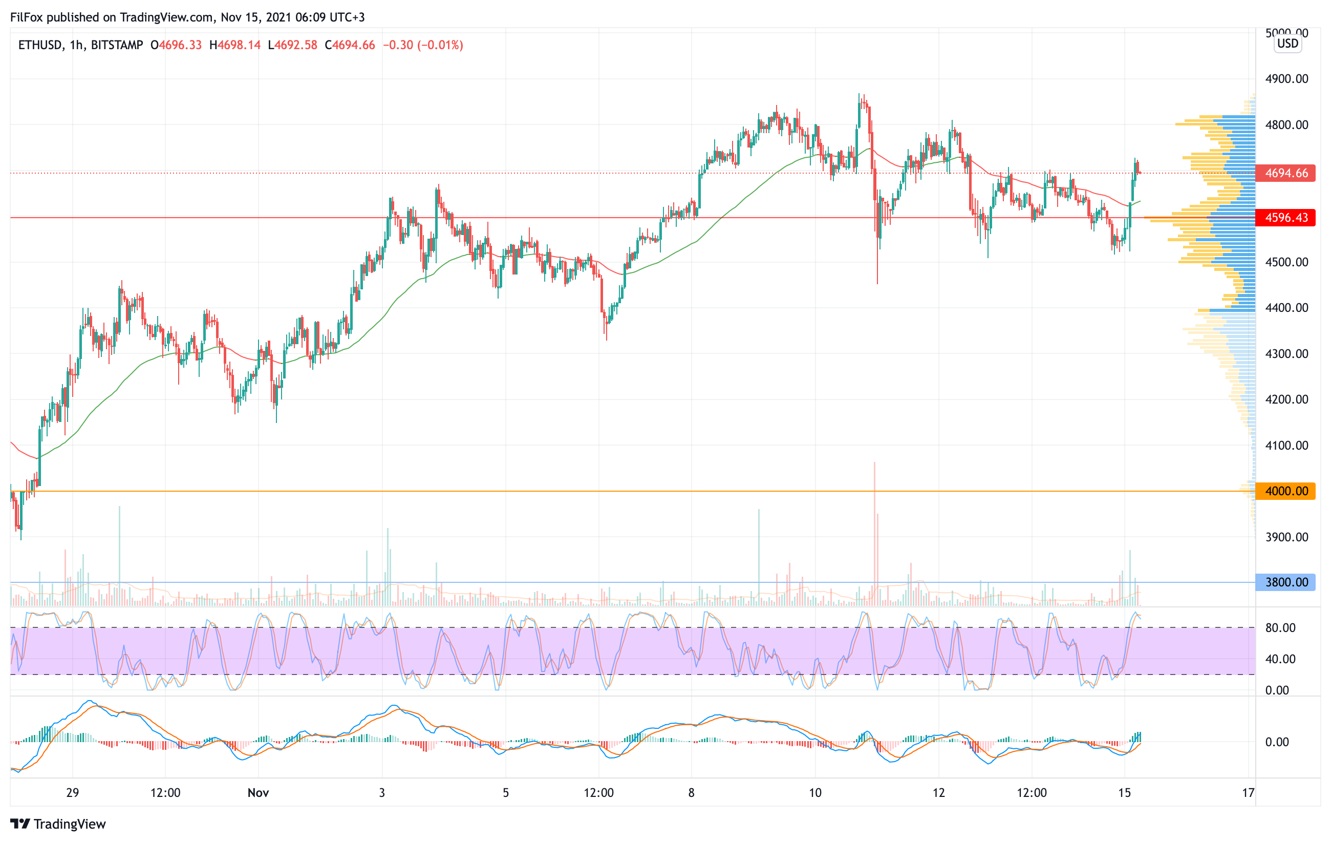 В воскресенье цена откатилась к поддержке 4500.00 USD, но к концу дня давление продавцов ослабло. За прошедшую ночь цена Ethereum восстановилась выше EMA55 и пытается удержаться на уровне 4700.00 USD.