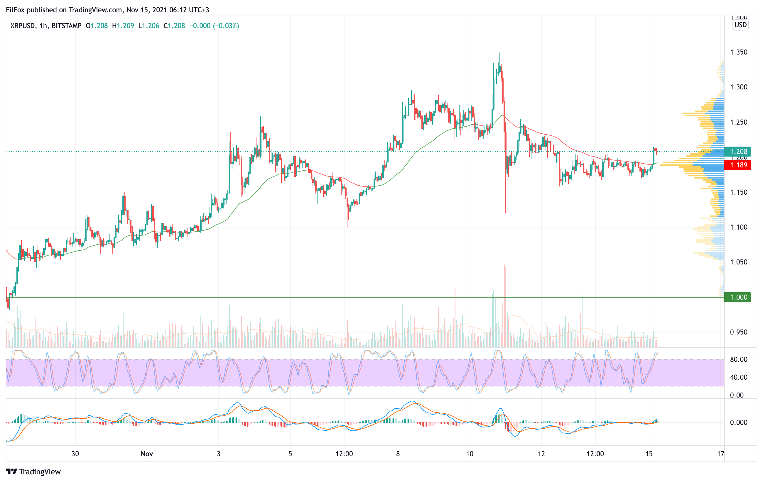 В конце минувшей недели покупатели боролись с сопротивлением часовой EMA55. Преодолеть это сильное сопротивление удалось только сегодня ночью, когда быки сформировали достаточно мощный импульс. Цена XRP проколола уровень 1.200 USD и пытается закрепиться в этом районе в узкой консолидации.