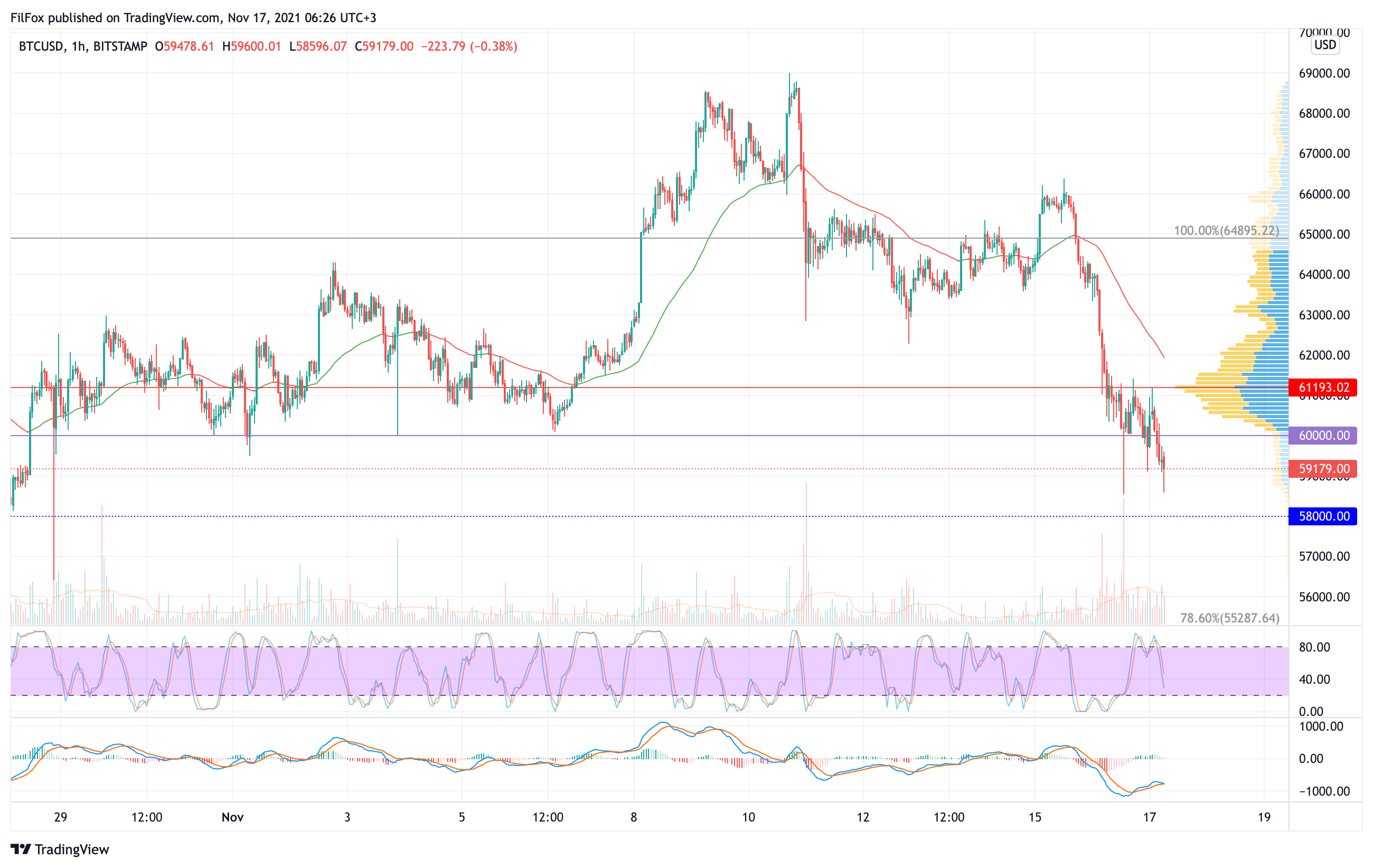 Вчера падение цены Bitcoin продолжилось ниже психологической поддержки 60000.00 USD. Определяем возможные уровни дальнейшего снижения.