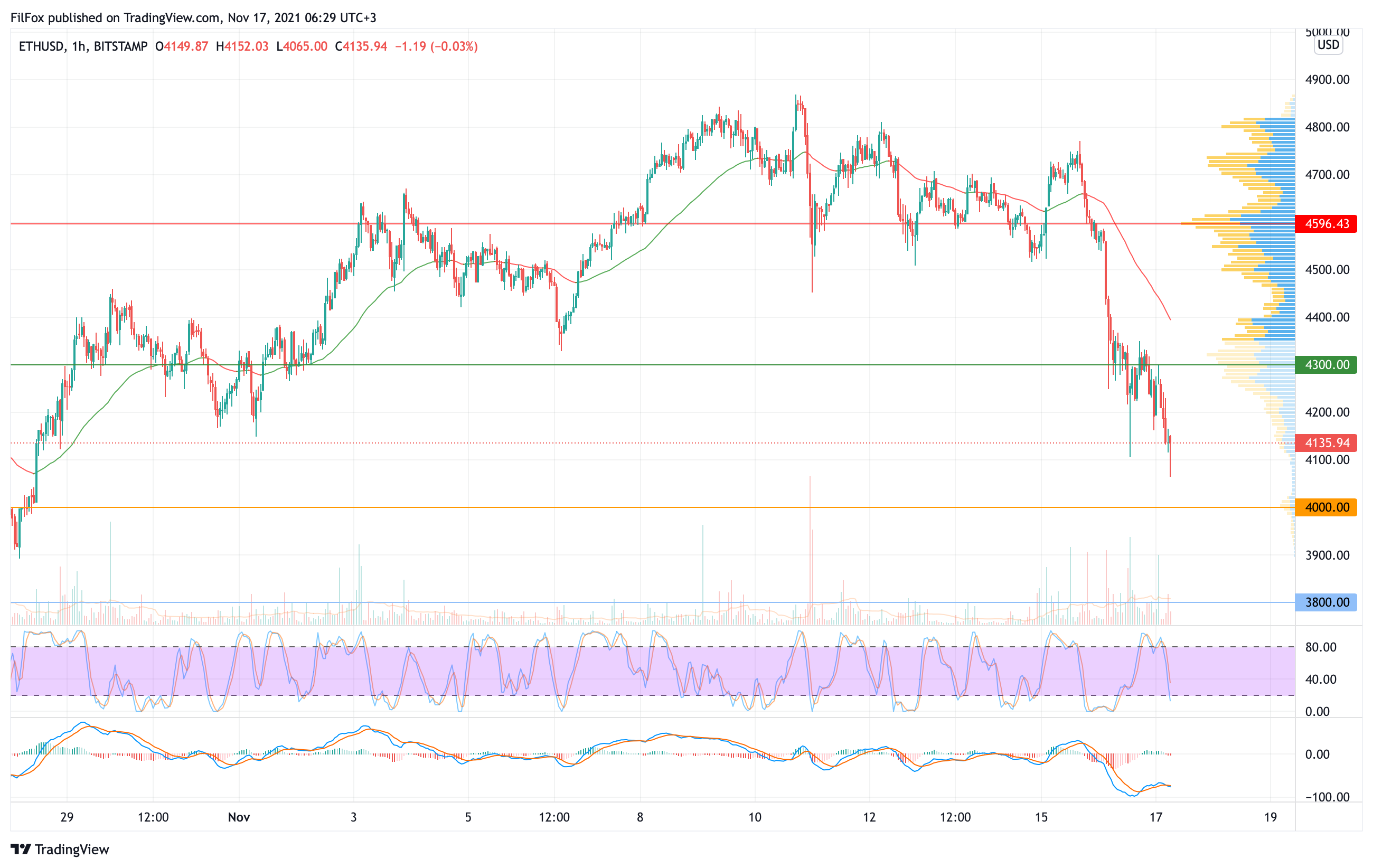 Вчера утром продавцы несколько раз смогли проколоть поддержку 4300.00 USD, и каждый раз пытались обновить месячный минимум. Днём цена Ethereum пробила поддержку 4200.00 USD, обозначив минимум в районе отметки 4106.00 USD.