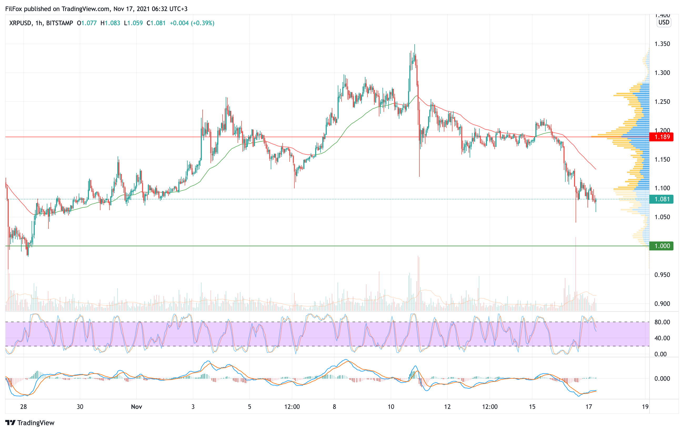 Вчера в первой половине дня цена XRP просела к уровню 1.100 USD, однако наши надежды на эту поддержку не оправдались и медведи пробили её, установив дневной минимум в точке 1.041 USD.