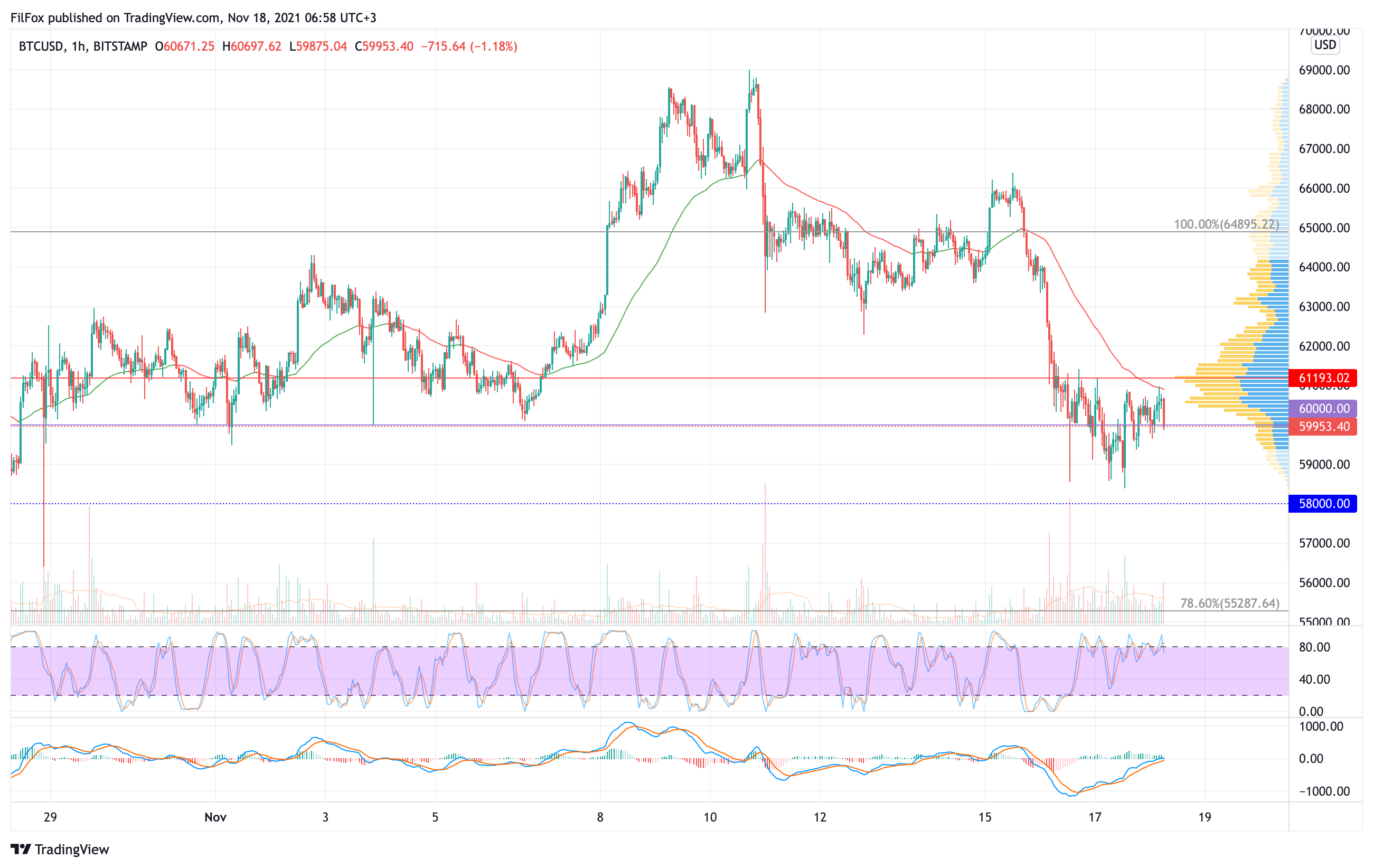 Вчера цена биткоина восстановилась выше 60000.00 USD, но преодолеть сопротивление часовой EMA55 пара так и не смогла. Сегодня ночью цена протестировала эту скользящую среднюю и на утро откатилась ниже психологической отметки шестьдесят тысяч.
