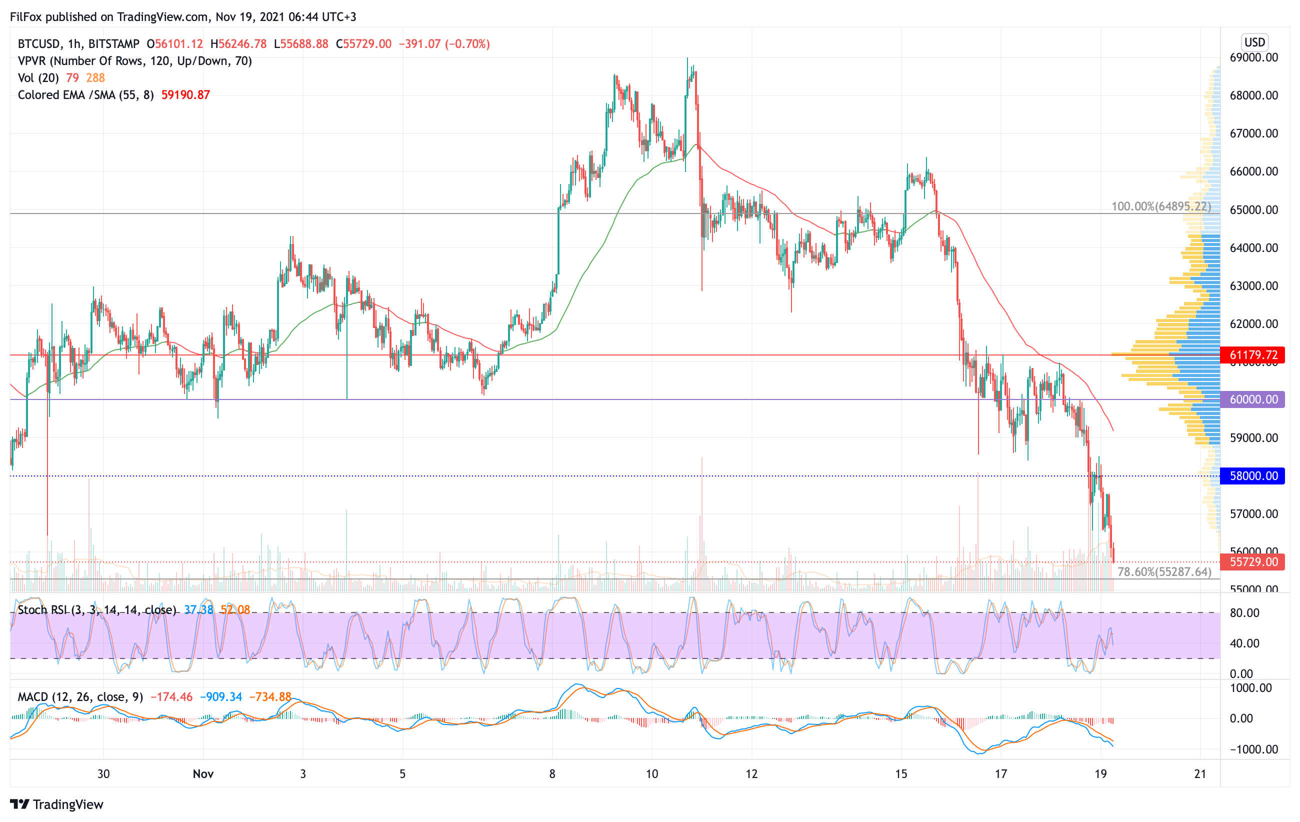 Вчера натиск со стороны медведей усилился и цена биткоина откатилась к поддержке 58000.00 USD. Объёмы продаж были достаточно большие и медведям удалось продавить эту поддержку, установив очередной минимум в точке 56565.00 USD.