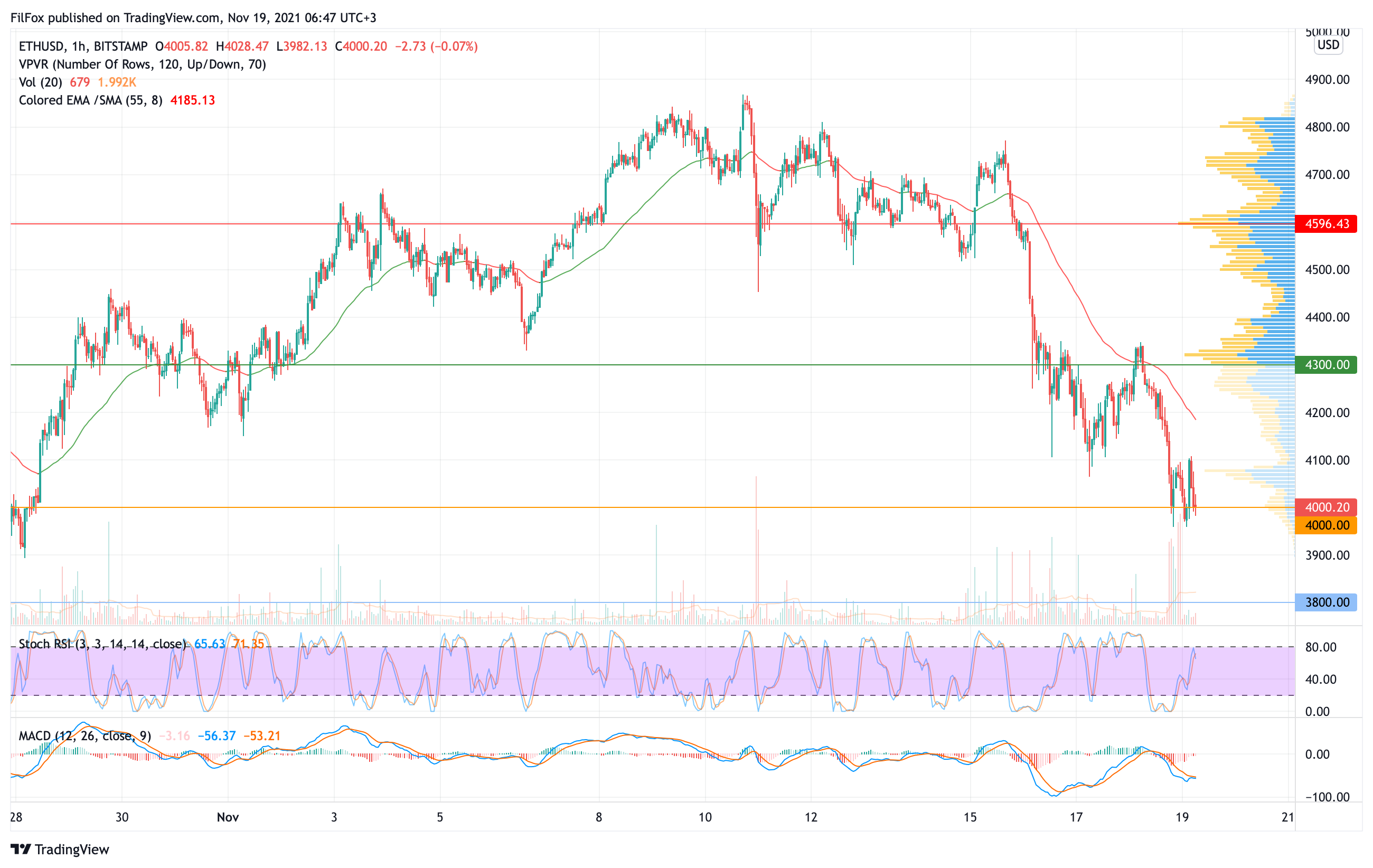 Вчера цена Ethereum испытала достаточно мощный медвежий импульс, который отбросил пару к психологическому уровню поддержки 4000.00 USD. Сегодня ночью продавцам удалось оттеснить цену ниже этого уровня, но объёмы торгов были очень мелкие и на утро пара опять пытается закрепиться выше психологической поддержки.