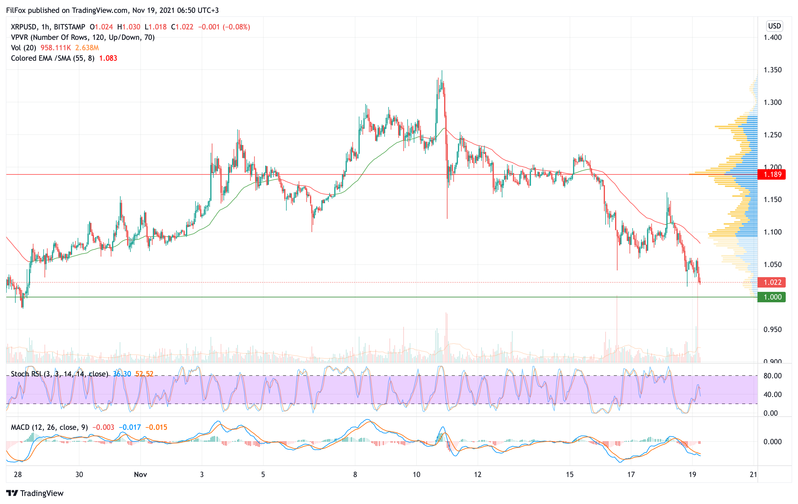 Вчера цена XRP откатилась к уровню один доллар за монету, установив дневной минимум в точке 1.016 USD.