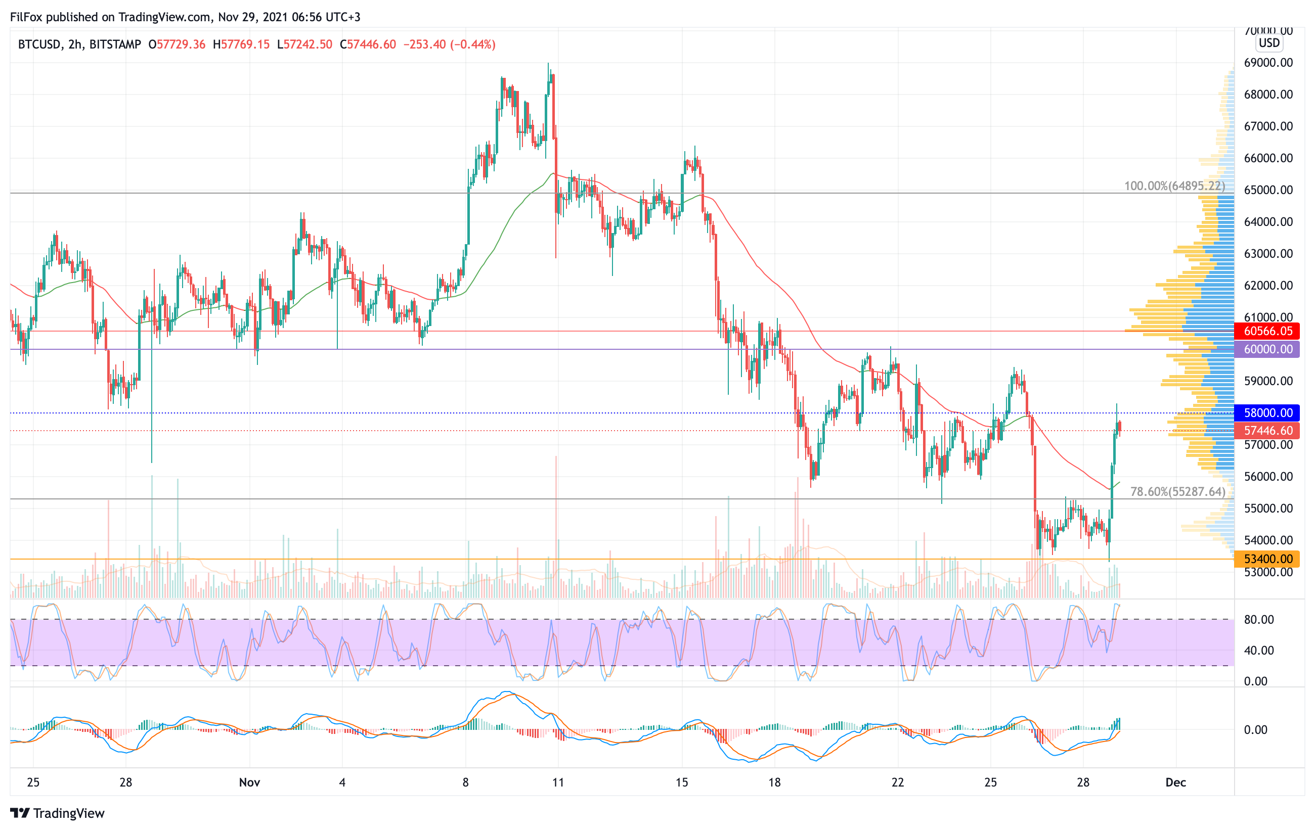 Эта неделя началась с интенсивного роста, который был поддержан достаточно крупными объёмами. На сегодняшнее утро цена BTC уже протестировала уровень 58000.00 USD, однако быки не смогли нахрапом пробиться выше этого сильного сопротивления.