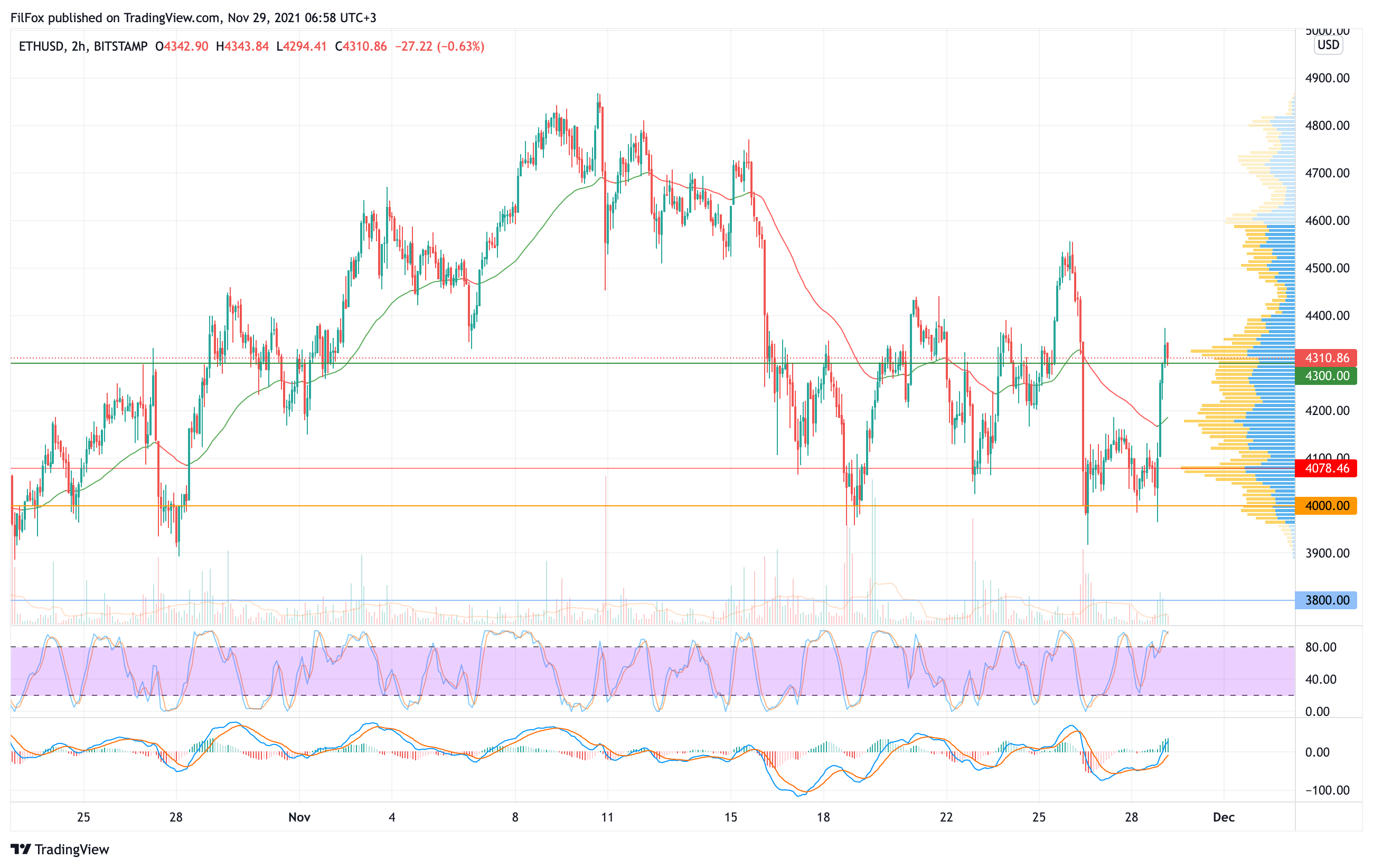 Сегодня ночью пара восстановилась выше уровня средних цен, а на утро быки пытаются закрепиться над отметкой 4300.00 USD. Если уровень 4300.00 USD отработает как поддержка, то восстановление продолжится в область 4500.00 USD, а локальный максимум возможен в районе 4600.00 USD.