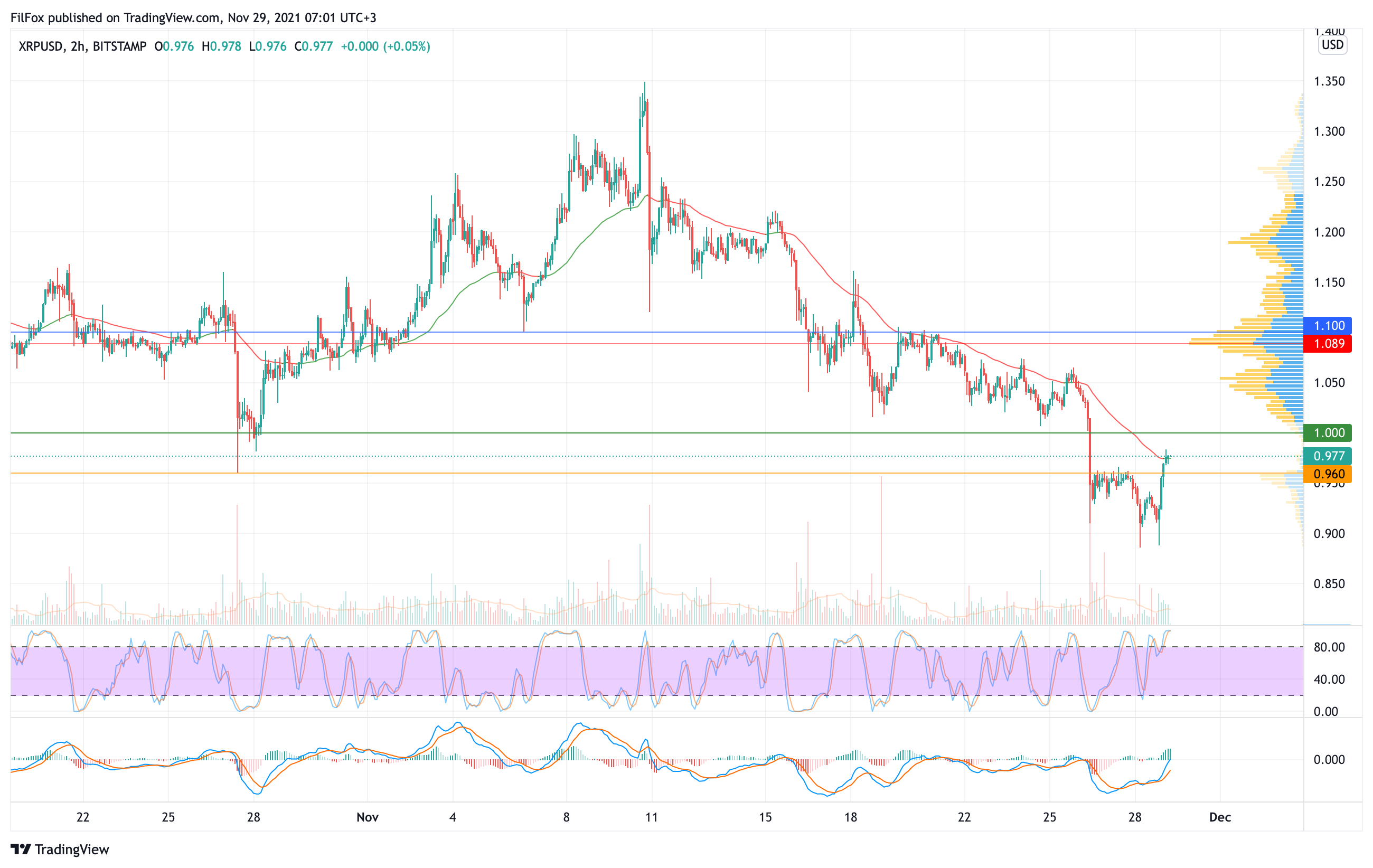 В воскресенье цена XRP обновила ноябрьский минимум в точке 0.886 USD, а сегодня ночью восстановилась выше оранжевого уровня 0.960 USD.