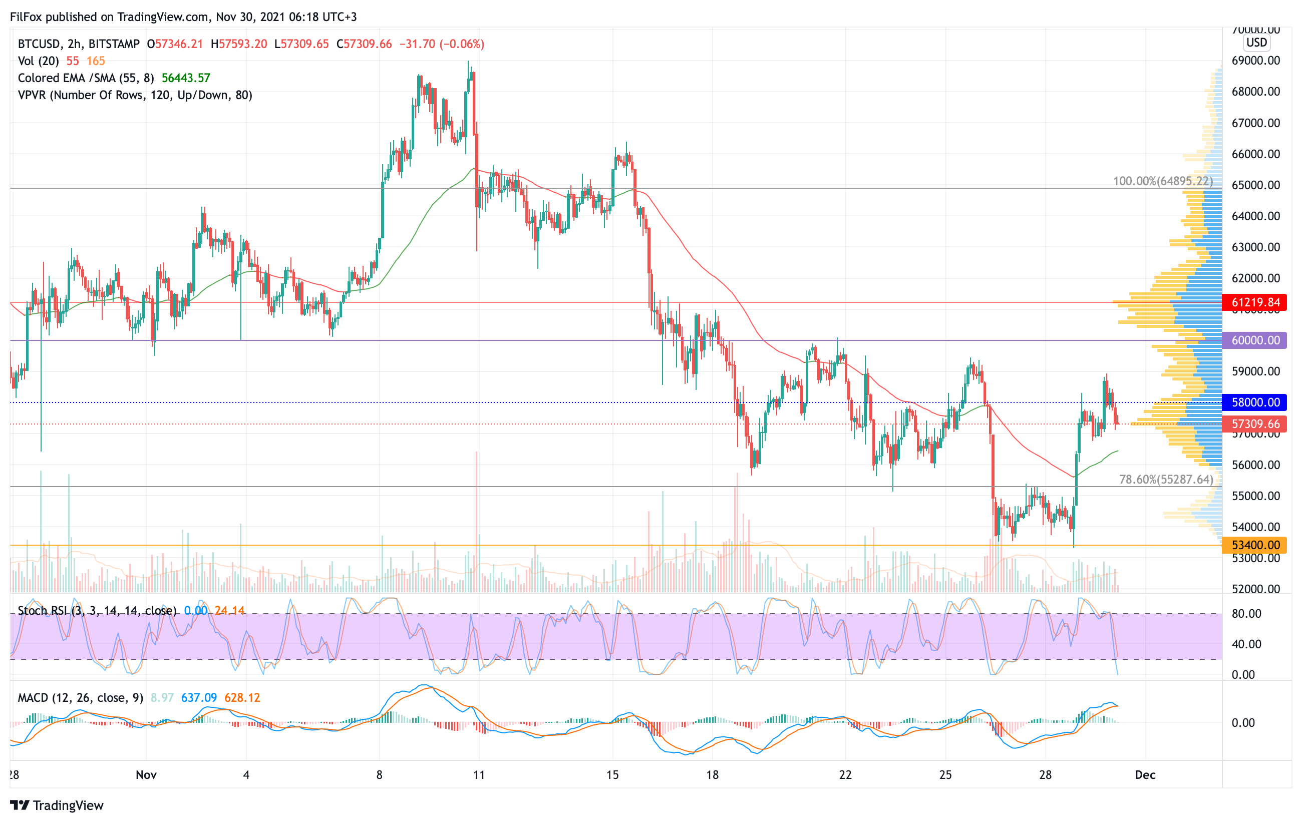 Пока мы не видим, что пара BTC/USD покинула нисходящий канал локального даун-тренда. Если же уровень средних цен поддержит пару, то до конца дня возможен прорыв выше шестидесяти тысяч.