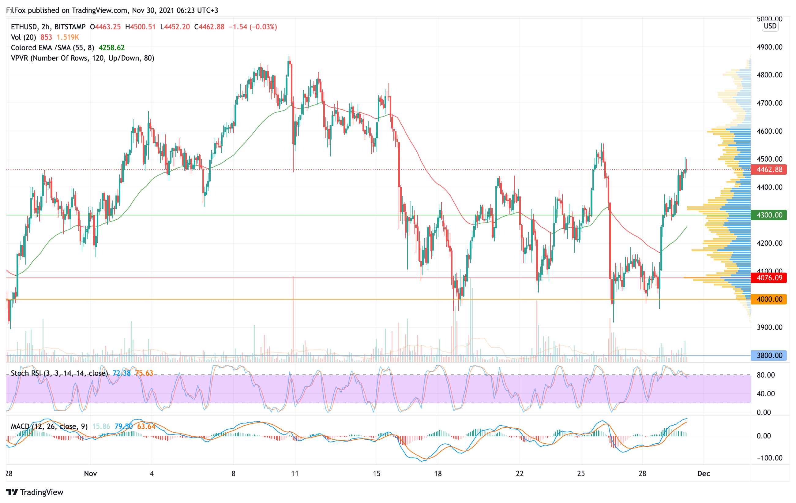 Вчера цена Ethereum смогла закрепиться выше зелёного уровня 4300.00 USD и продолжить восстановление в область 4500.00 USD. Сегодня ночью локальный максимум был установлен в районе отметки 4508.00 USD.