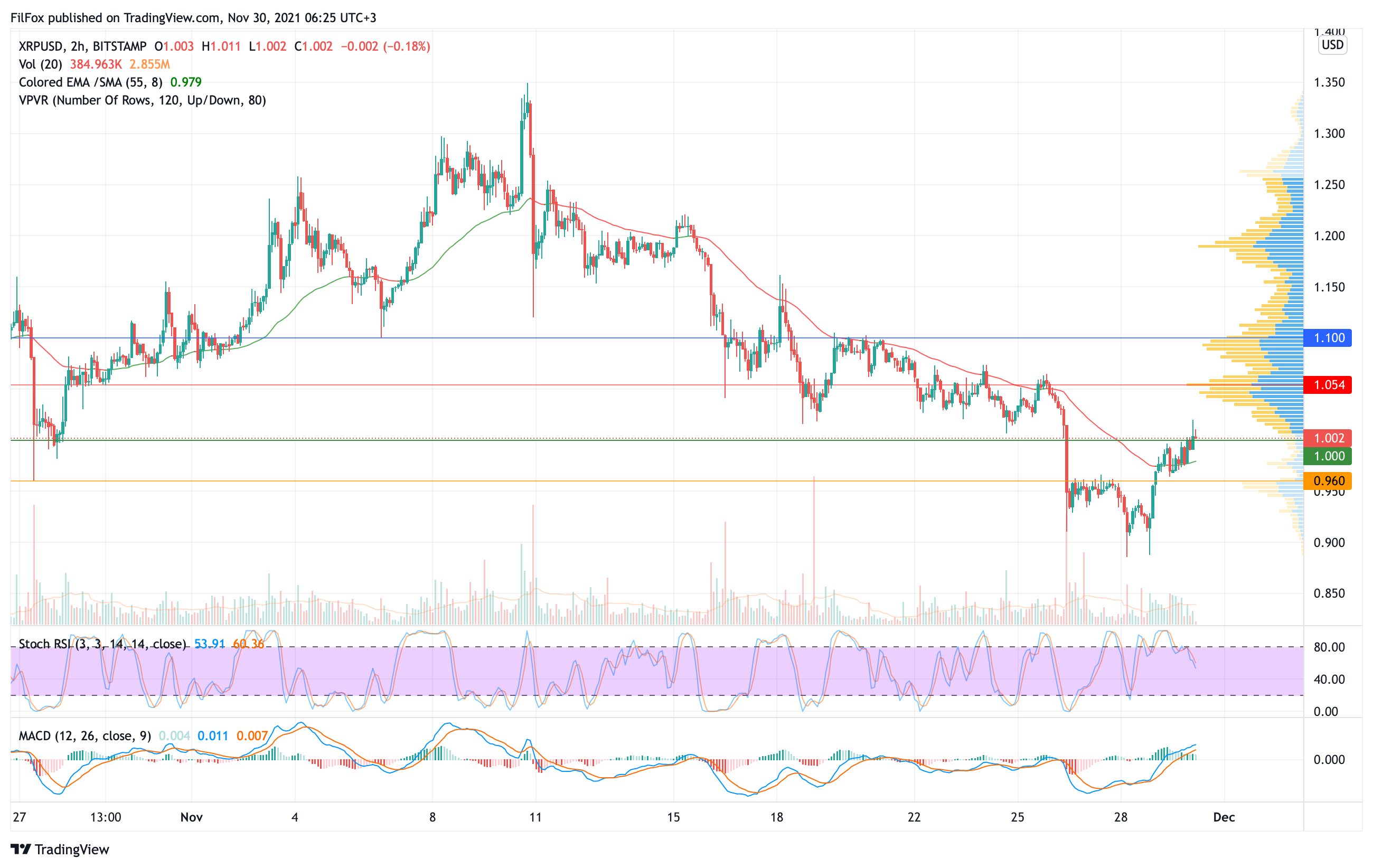 Вчера цена XRP с большим трудом удержалась выше двухчасовой скользящей средней EMA55 и к завершению дня восстановилась к психологической отметке один доллар за монету.