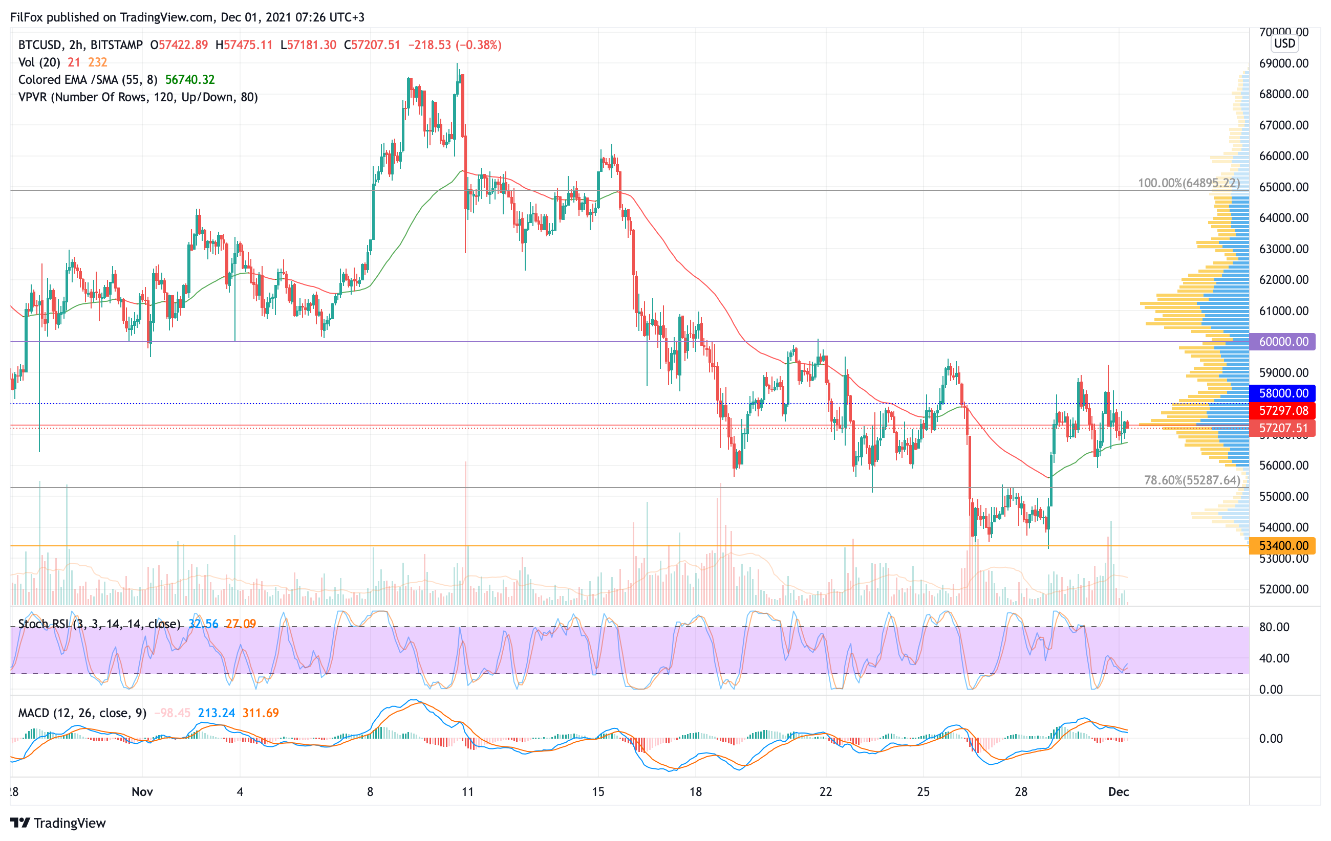 Вчера двухчасовая EMA55 удерживала цену битоина в боковой консолидации. Во второй половине дня покупатели предприняли попытку протестировать уровень 60000.00 USD, но дневной максимум удалось установить только на отметке 59250.00 USD. К завершению дня пара опять откатилась в область средних цен.