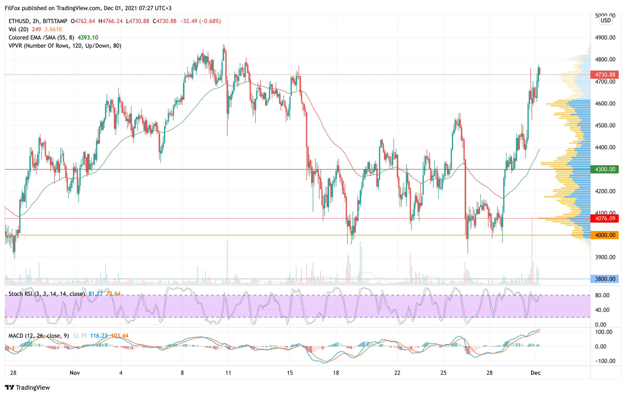 Вчера цена Ethereum продолжила восстановление и закрепилась выше сопротивления 4600.00 USD.