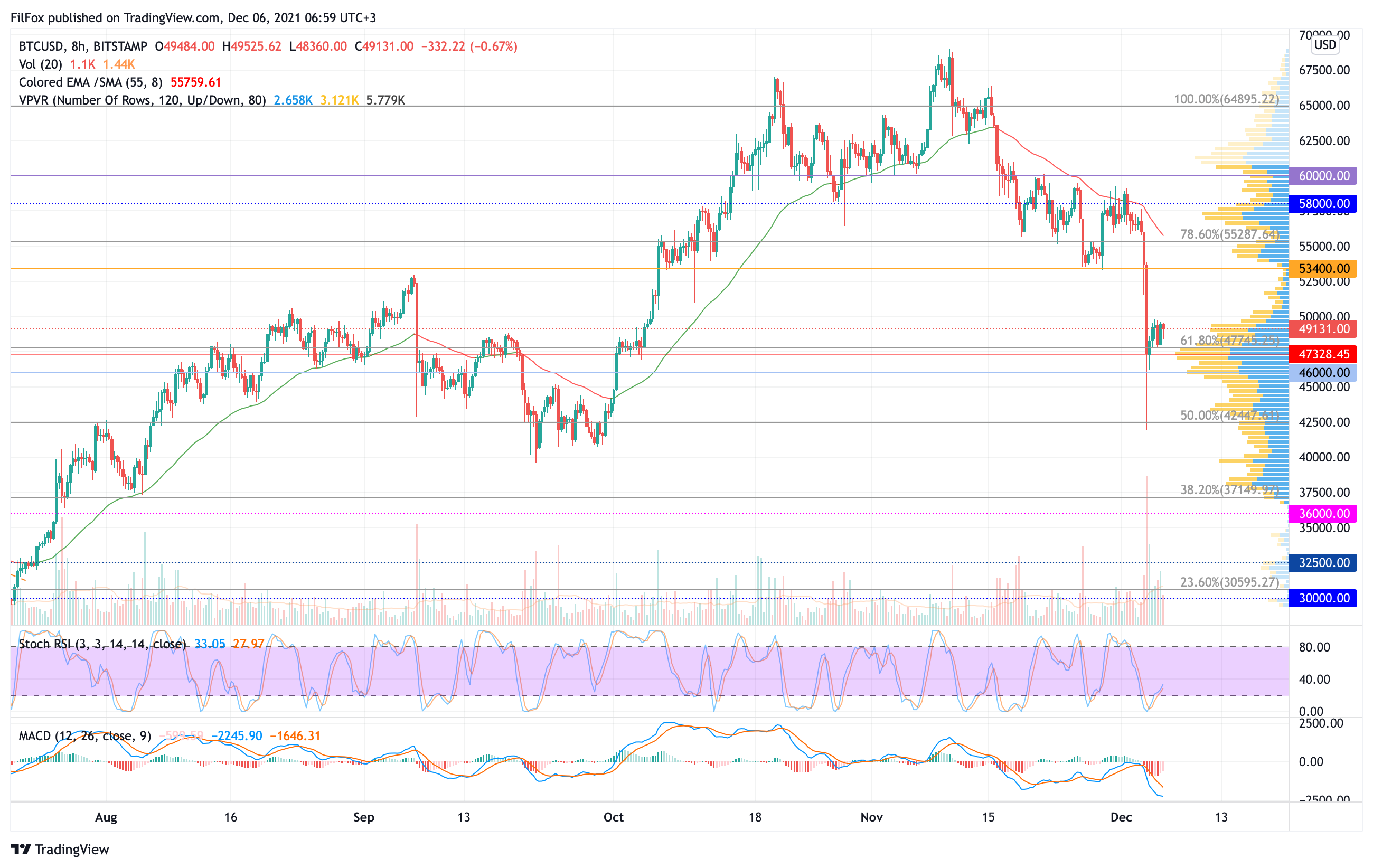 В субботу цена биткоина восстановилась выше уровня 61.8% фибо (47745.25 USD) и до конца недели закрепилась над ним в узкой боковой консолидации. Верхней границей бокового коридора выступало сопротивление на отметке 49800.00 USD, которое покупатели так и не смогли протестировать.