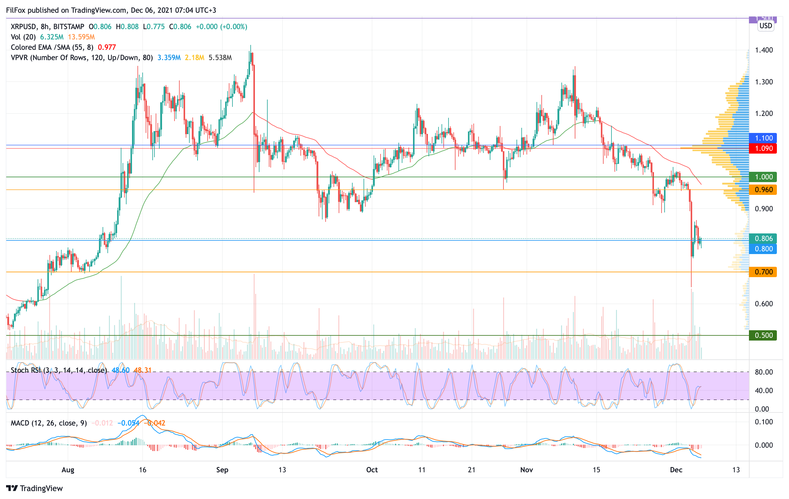 На выходных цена XRP восстановилась выше сопротивления 0.800 USD и обозначила локальный максимум в точке 0.864 USD.