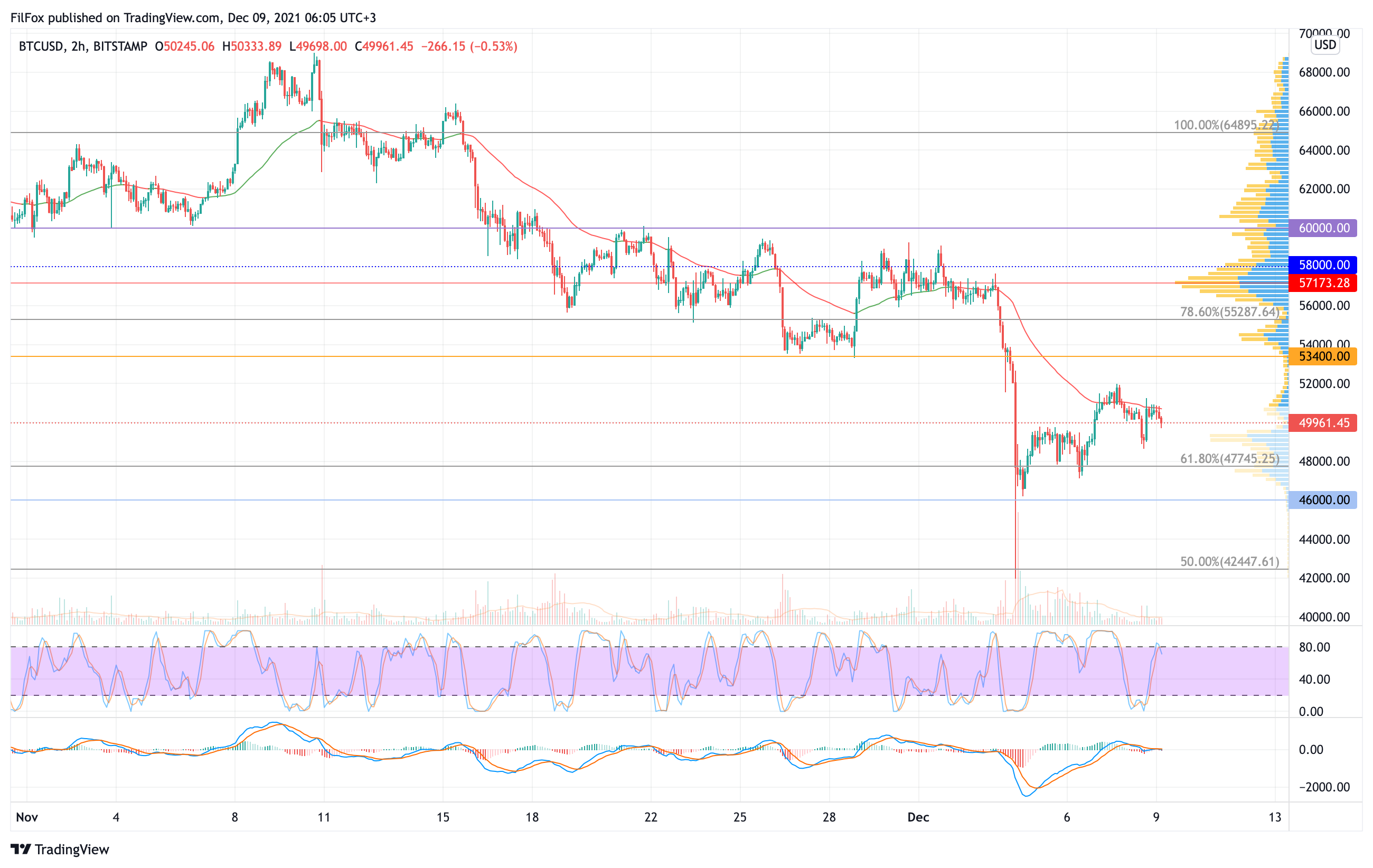 Вчера в первой половине дня объёмы торгов были очень низкие. Цена биткоина опустилась ниже психологической отметки 50000.00 USD, установив дневной минимум в точке 48656.00 USD.