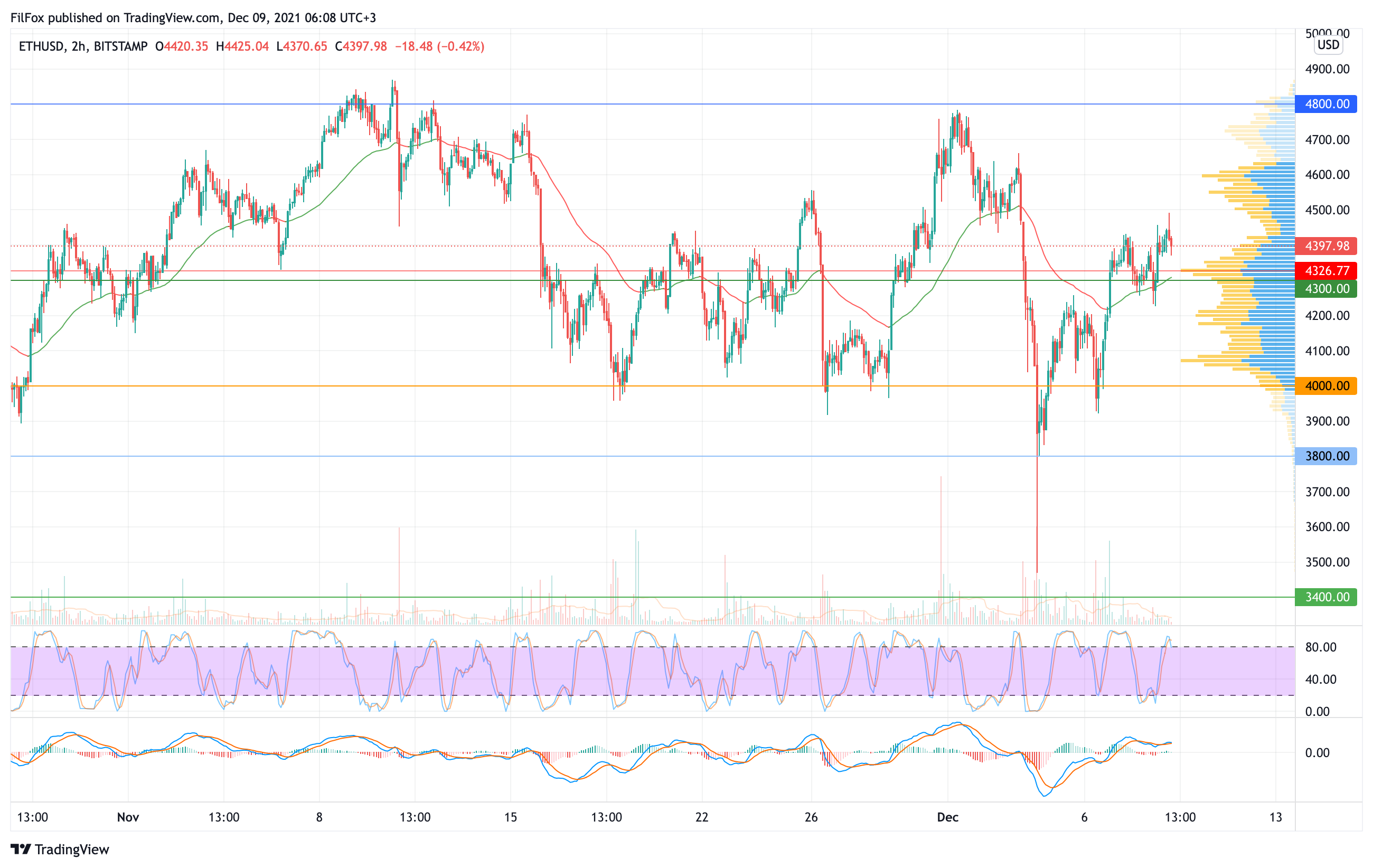 Вчера продавцы пытались продавить поддержку двухчасовой EMA55. В течение дня цена Ethereum проколола скользящую среднюю и обозначила дневной минимум в точке 4226.00 USD.