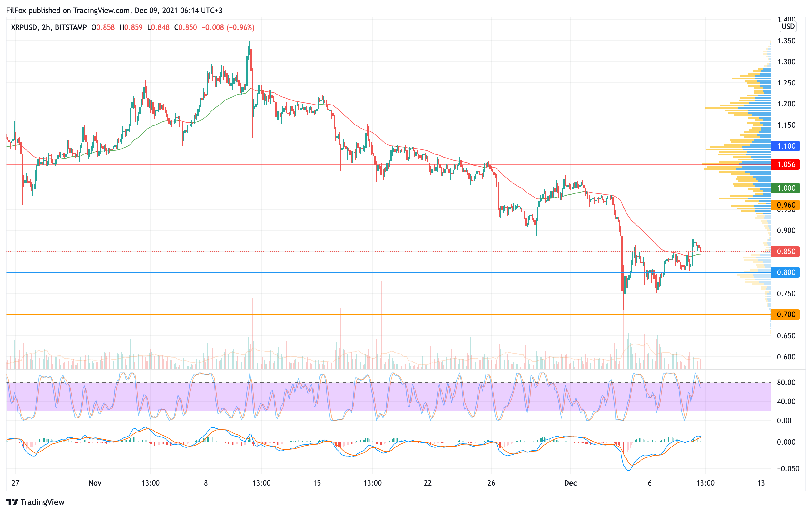 Вчера в первой половине дня покупатели не смогли прорвать сопротивление двухчасовой EMA55, а после обеда их попытка оказалась более удачливей. Ближе к ночи цена XRP зафиксировала локальный максимум в точке 0.885 USD.